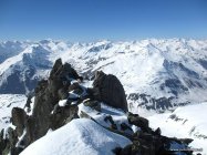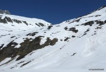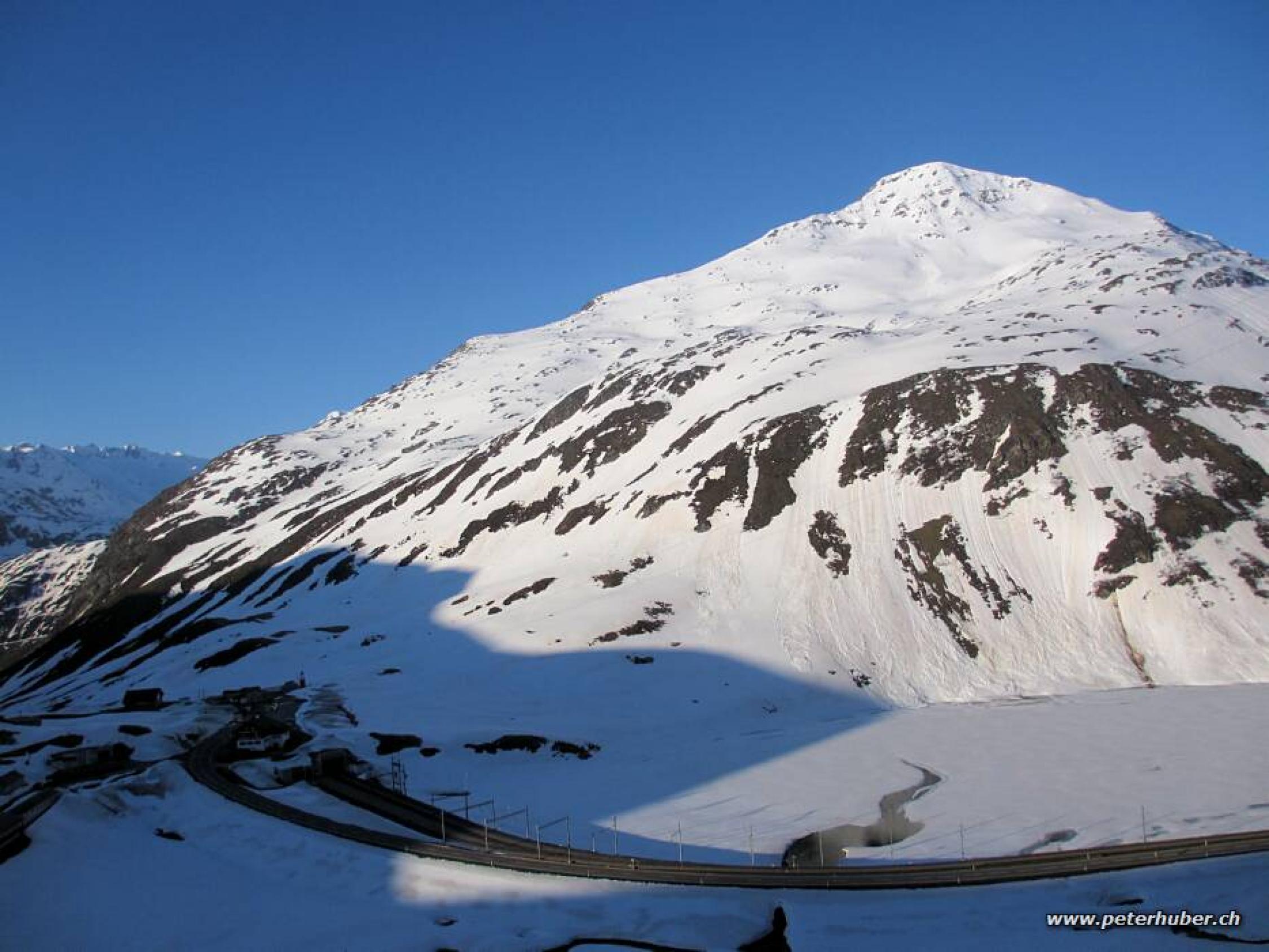 Um 6:30 Uhr +5°. Dank der klaren Nacht davor war der Schnee gut gefroren. Es hat noch durchgehend Schnee gleich vom Pass weg. Schönes Wetter, auf dem Gipfel windig. Der Fussanstieg zum Gipfel war streng, tiefer griesiger Schnee. Harscheisen sind in der oberen Hälfte dienlich.
