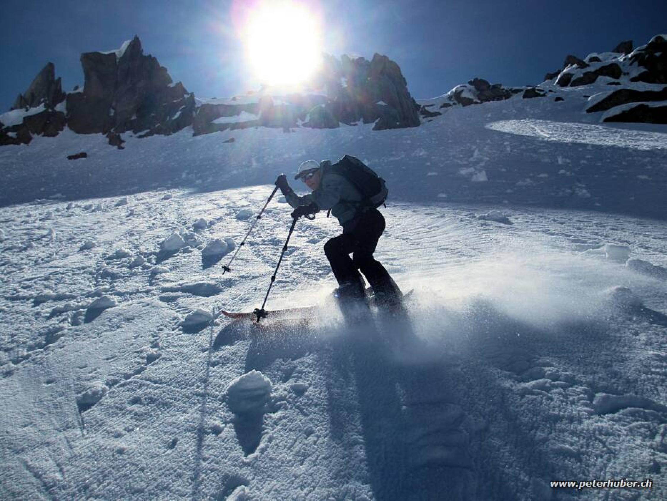Die Tour liegt morgens lange im Schatten. So muss man nicht allzu früh starten. Der Schnee reicht noch für ein paar Tage ohne Ski tragen.
