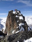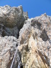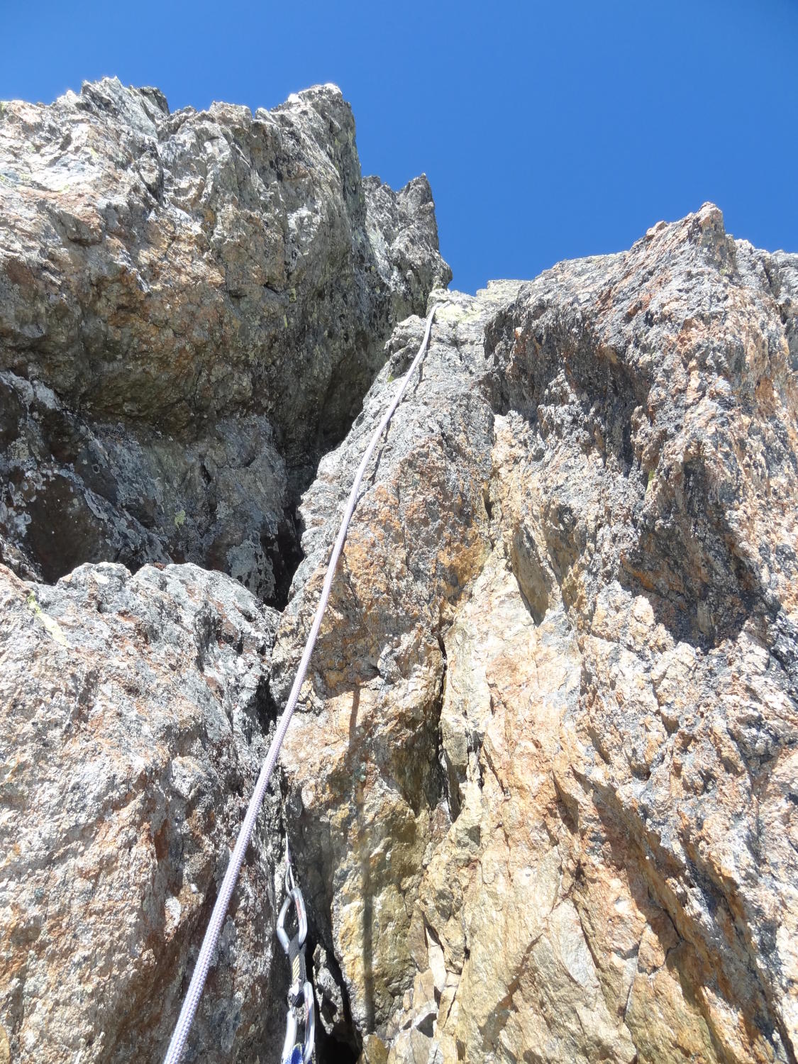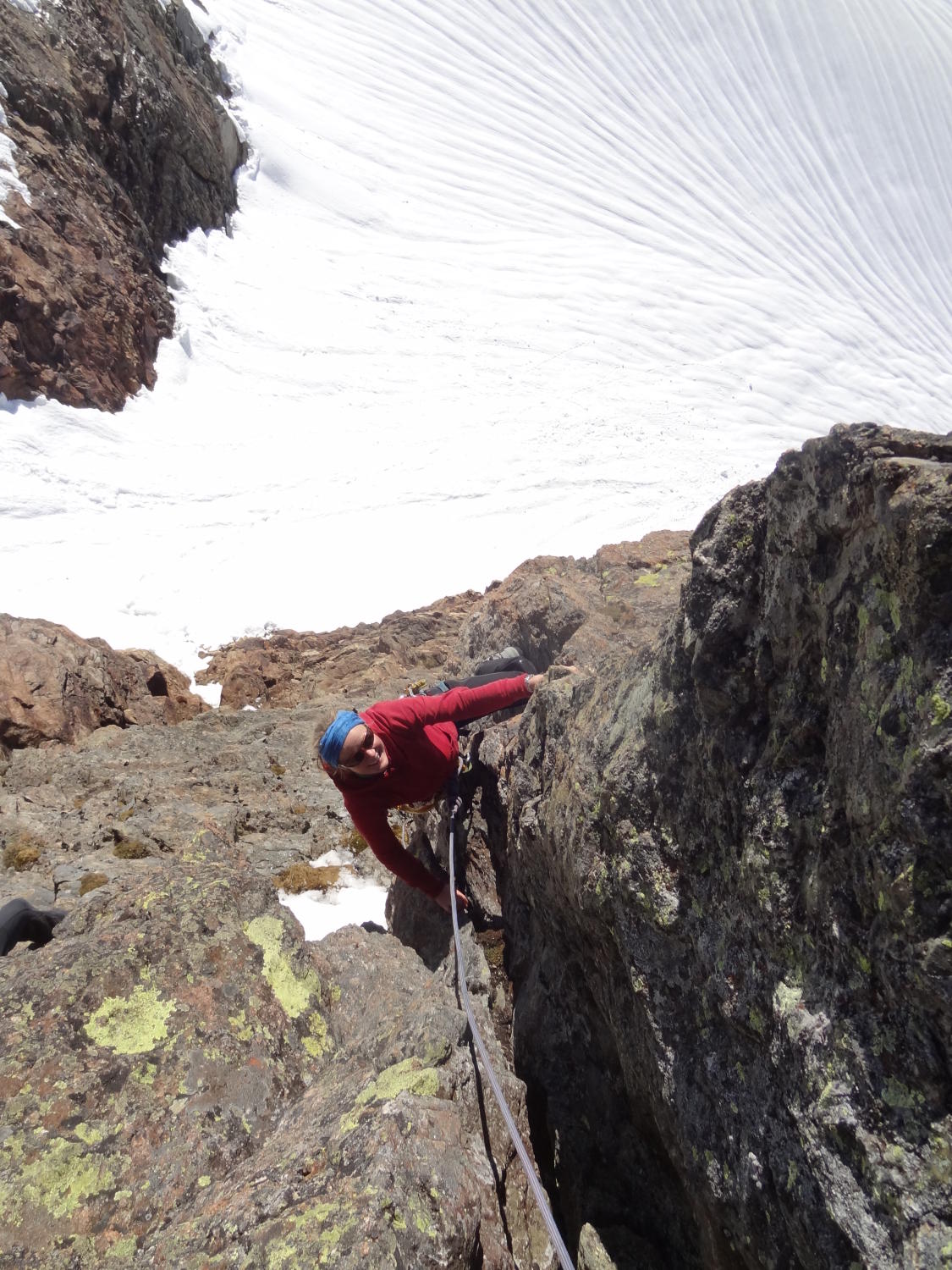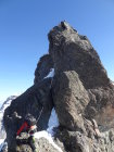 Nun folgt die Crux des Aufstiegs. Auf der Südseite des Grates führt ein ca. 8 m hoher, senkrechter Riss auf die Gratkante zurück (ca. 5. Grad - wir haben hier (zumindest für die Vorsteiger) von den Skischuhen+Steigeisen auf Kletterfinken gewechselt. Kletterstelle ist nicht eingerichtet. Unten guter Stand mit Friends und/oder Keilen möglich. Oben stabiler Felszacken mit Seilstück (vorhanden), welches später zum Abseilen dient. In dieser Stelle guter, fester Fels.