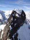 Vom Wintergipfel führt eine verschneite, einfache Flanke in eine erste Scharte. Von dort muss ca. 20 m (II+) hochgeklettert werden (anfangs sehr brüchig, danach besserer Fels. Keine Sicherungen vorhanden, zuoberst jedoch eine Abseilstelle (älteres Reepschnürchen mit Maillon). Dann eine kurze, einfache Traverse auf den höchsten Punkt dieses ersten Turmes. Dort kann an Felszacken gut Stand bezogen werden. Nun in die zweite Scharte Abseilen (nicht eingerichtet, Reepschnurstück mitnehmen). Wir haben dort ein Seil hängen gelassen um uns den Wiederaufstieg zu erleichtern (kurze Steilstufe in der Mitte etwas knifflig).
