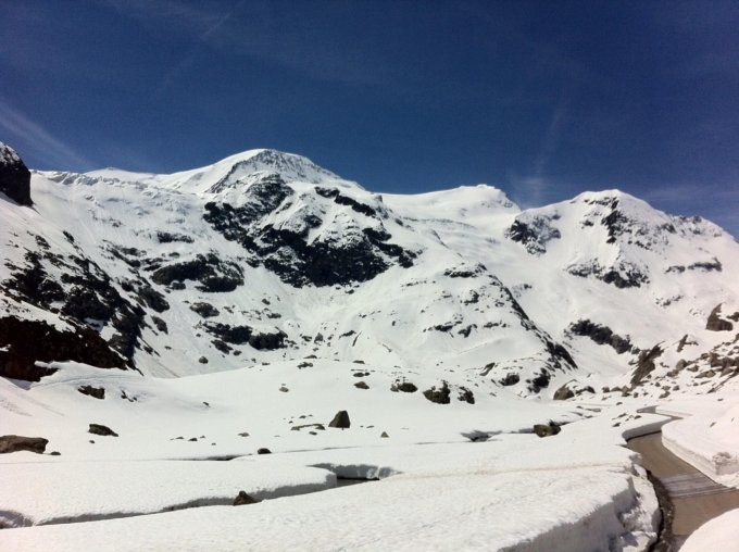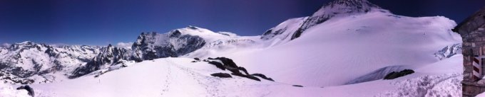 Sehr viel Schnee, alle Gletscherspalten und Gletscherbrüche sind eingeschneit. Abfahrt 11:00 über die gesamte Nordflanke. Bis Steingletscher durchgehend Schnee.