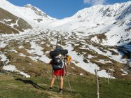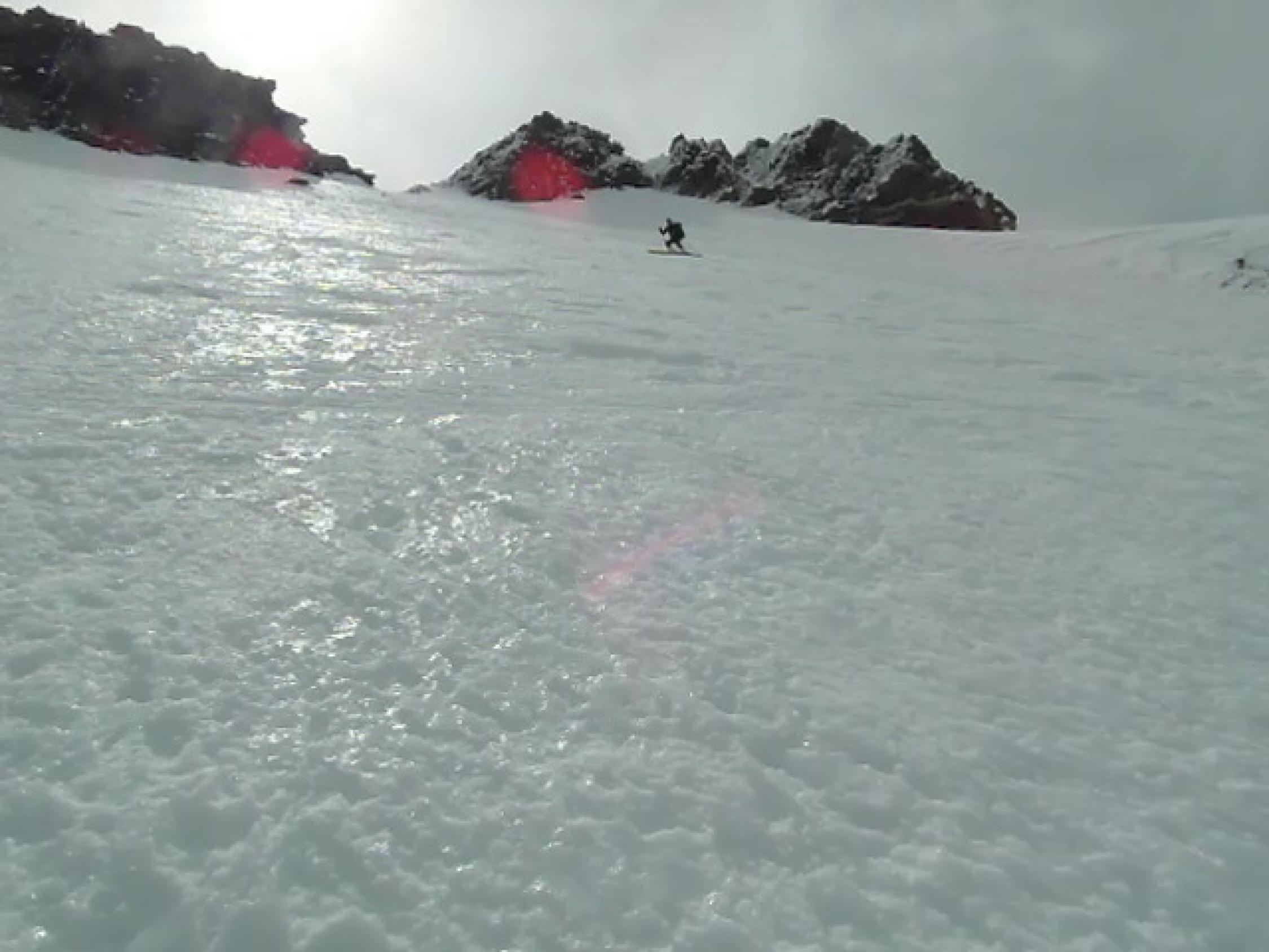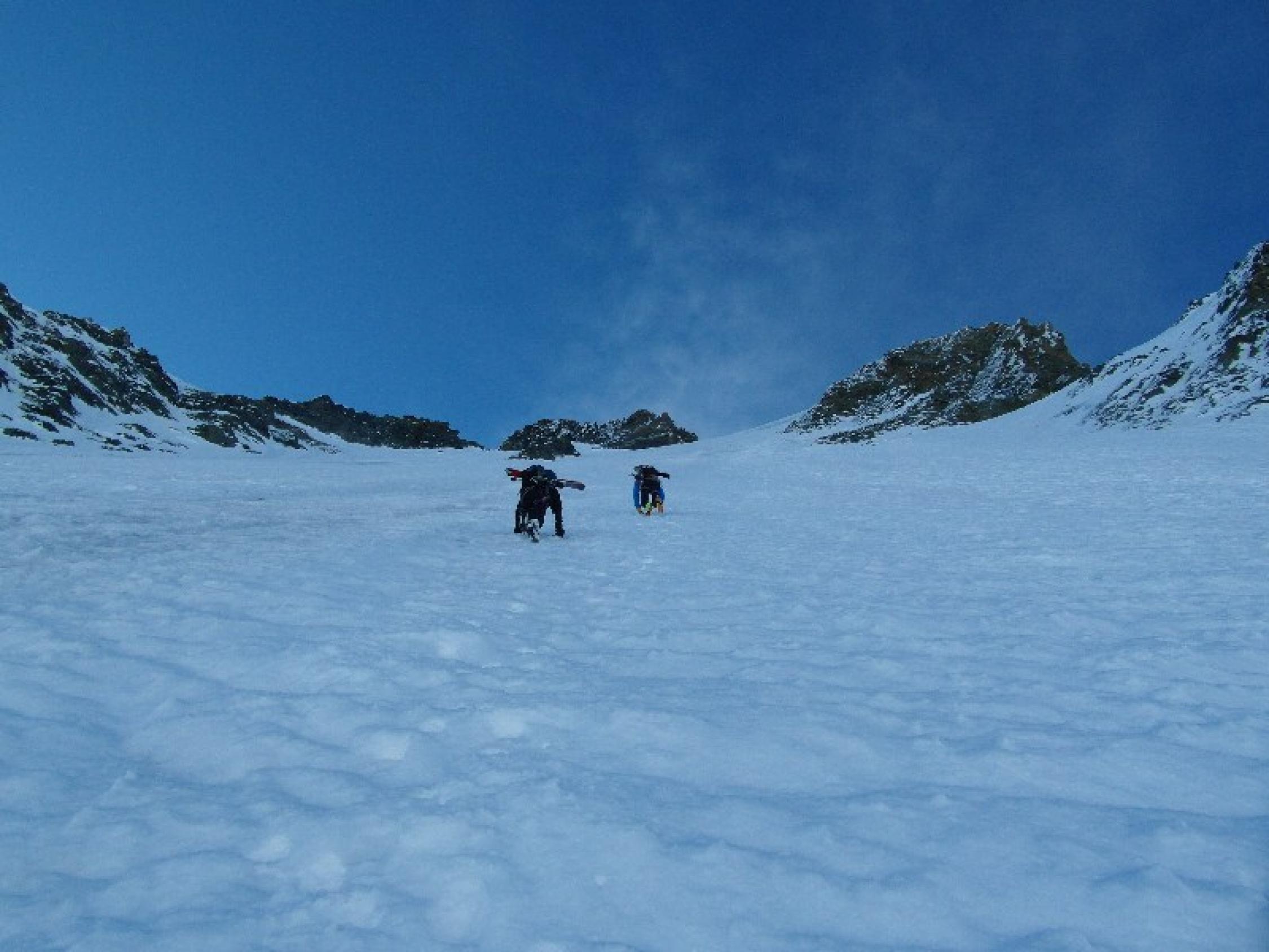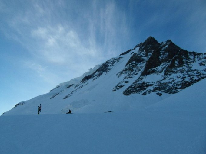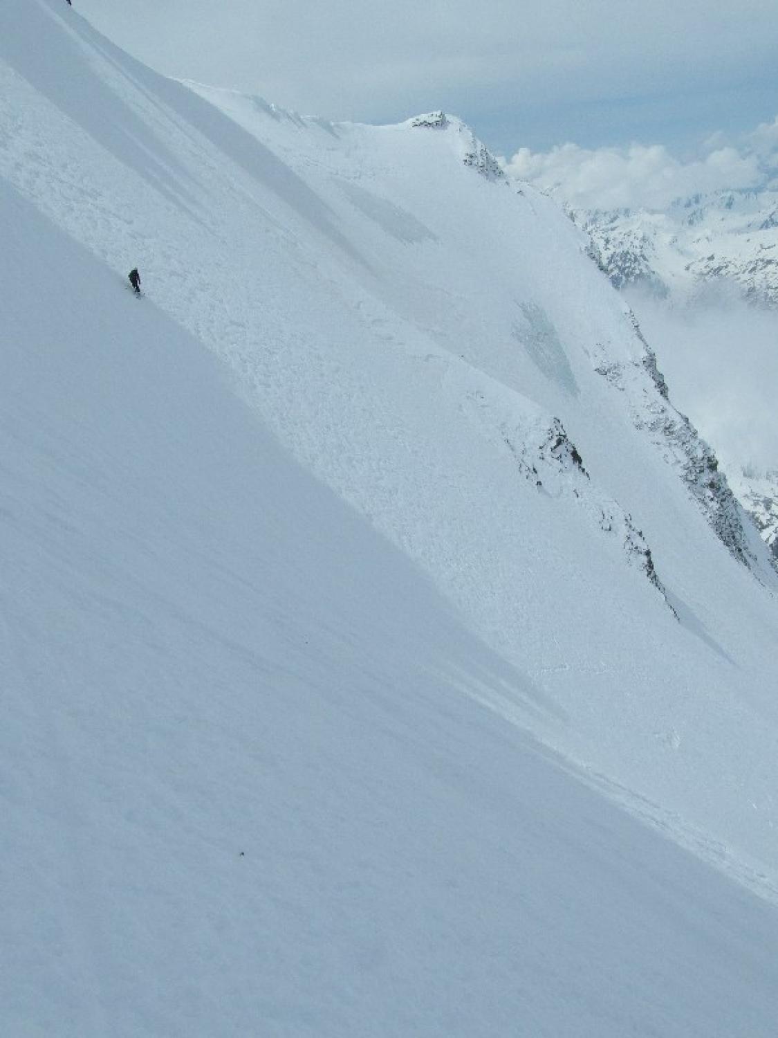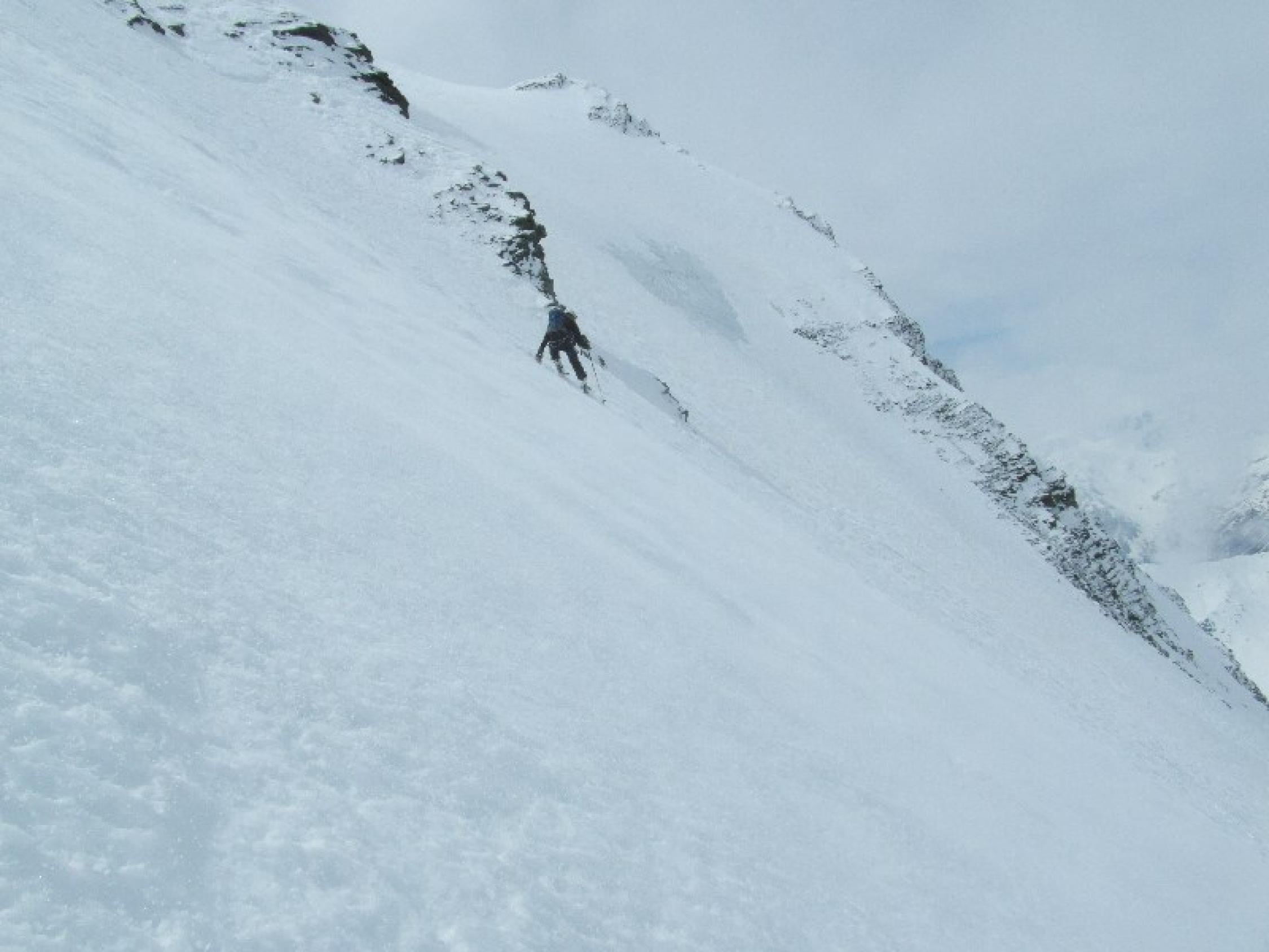 Wir hätten eine andere Abfahrstvariante wählen können, aber mein Freund träumte davon seit Jahren...! Aber mit seinen Marker Bindungen und Skis so schwer wie Ambosse, kommt er alles runter!