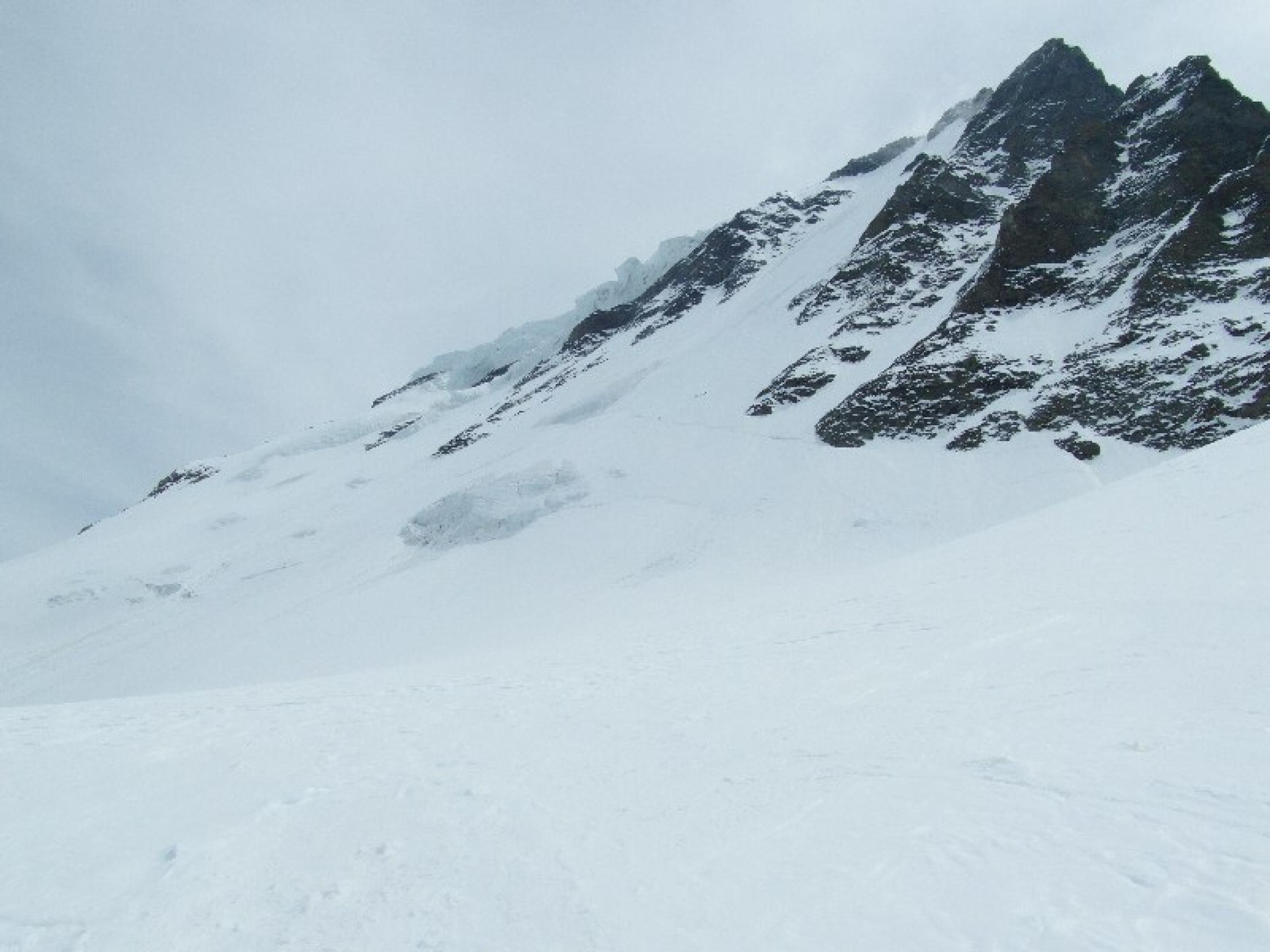 Abscheuliche Verhältnisse in der Wand, vereister Schnee, allein in den letzten 100-150 Metern berührt man Pulver unter einem langsam weicher werdenen Deckel.