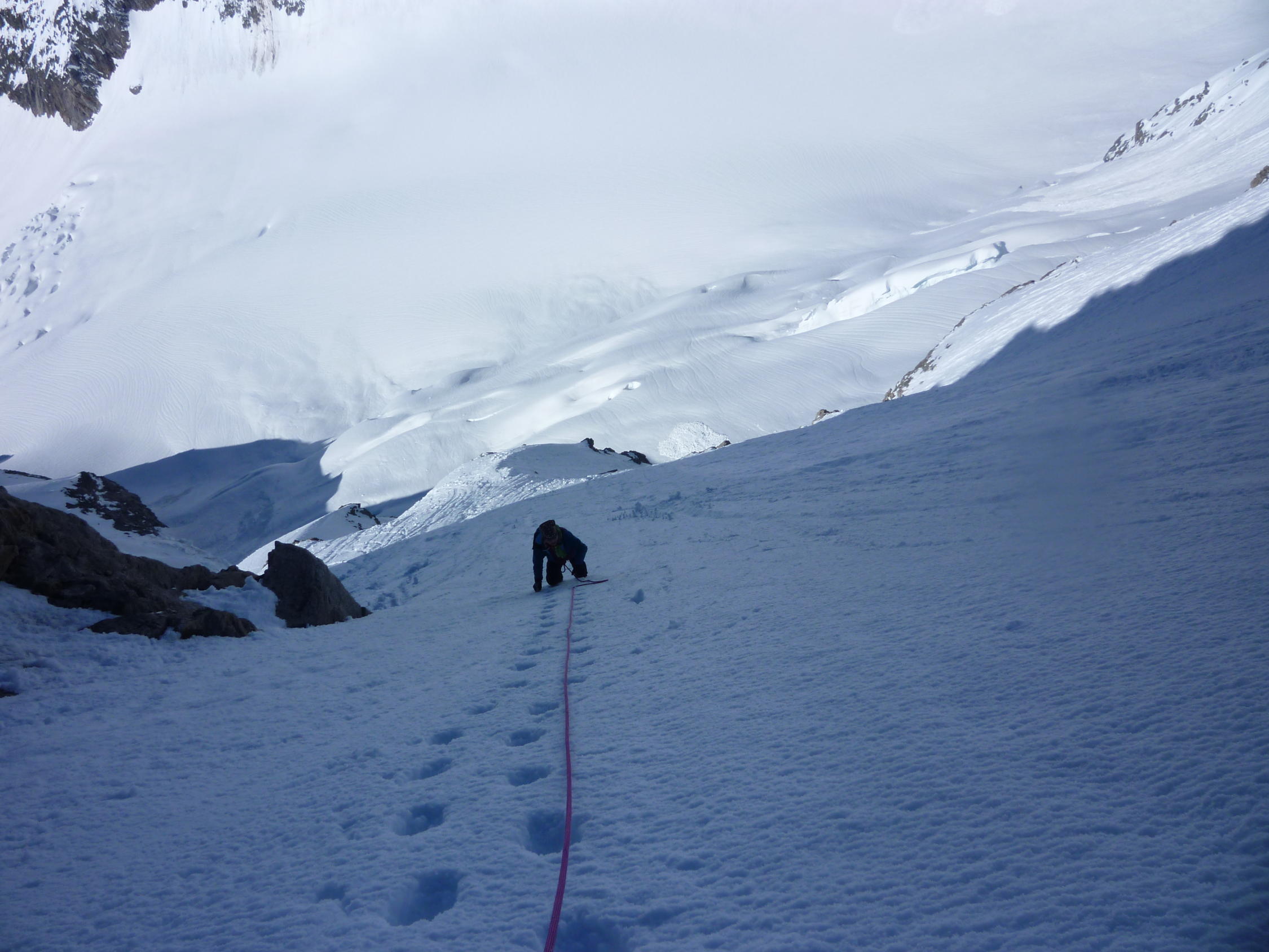 20 min Skitragen bis ca. 1750 m, ab dort geschlossene Schneedecke. Später Start (8:30) in L'A Neuve, bis Petit Col Ferret dennoch gut tragend. Ostexponierte Querung nach dem Petit Col Ferret um 10:30 bereits stark aufgeweicht und Nasschneeabgänge. Bevor die Hänge unterhalb des Bivouac Fiorno erreicht werden, verläuft die Querung nach dem Col etwa 50 m längs einer Abbruchkante (Mitreissgefahr!). Daher Abbruch und Abfahrt zum Refuge Elena. Couloir unterhalb Petit Col Ferret hat etliche Gleitschneeanrisse, Vorsicht!