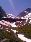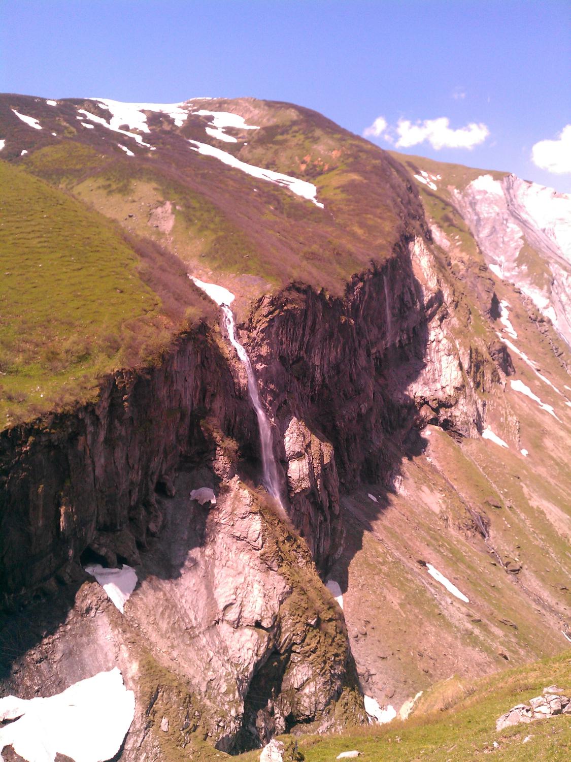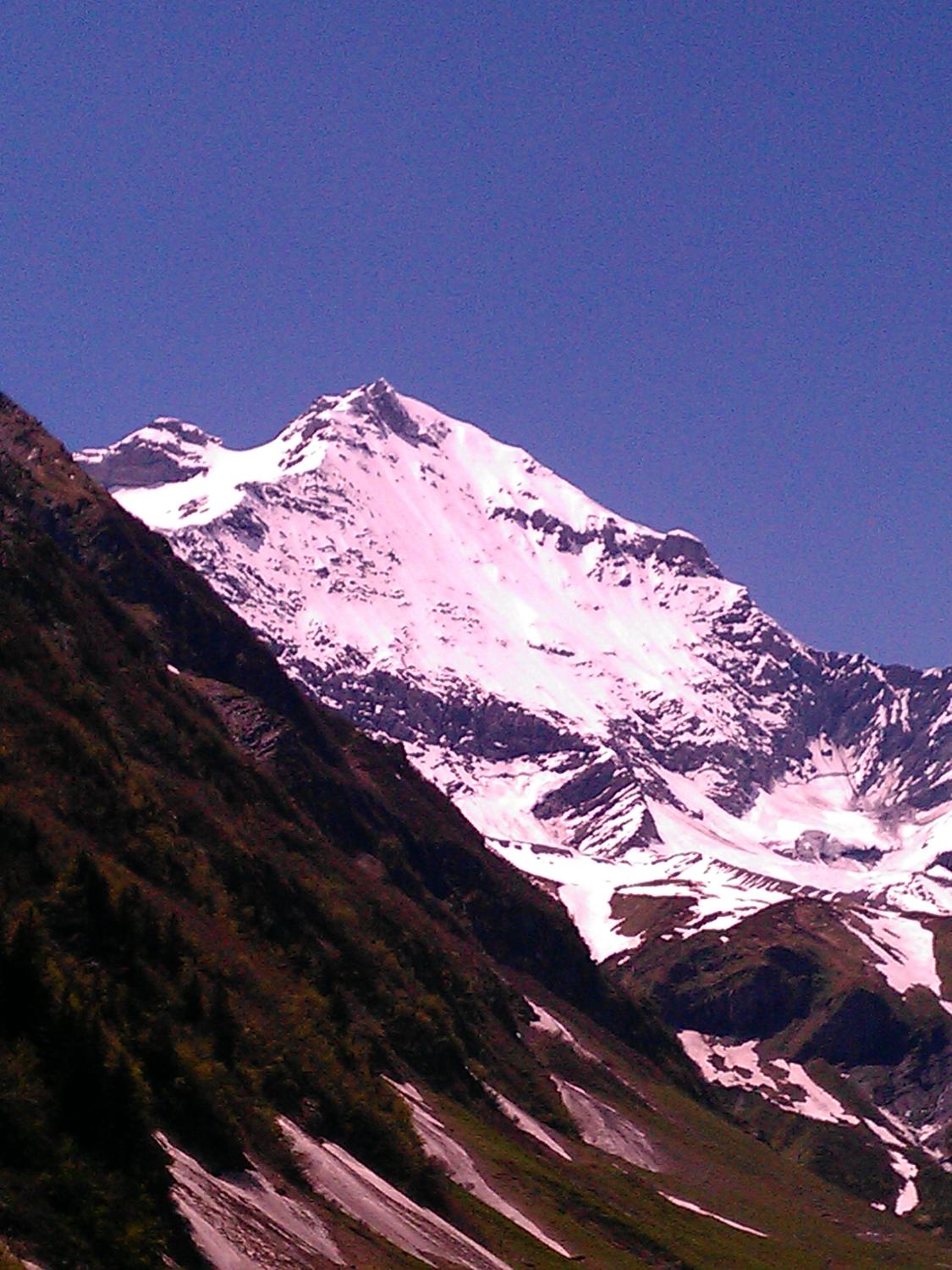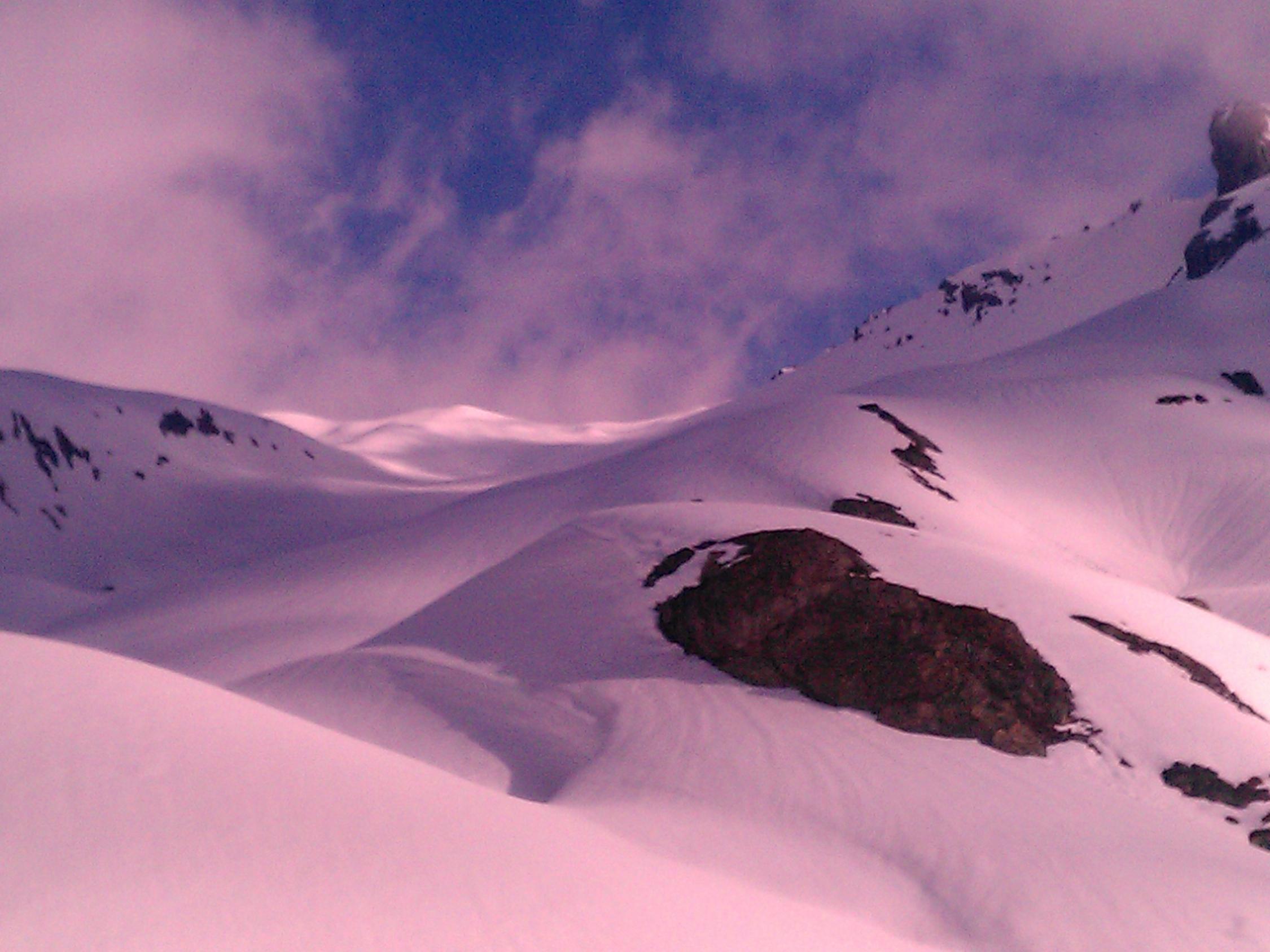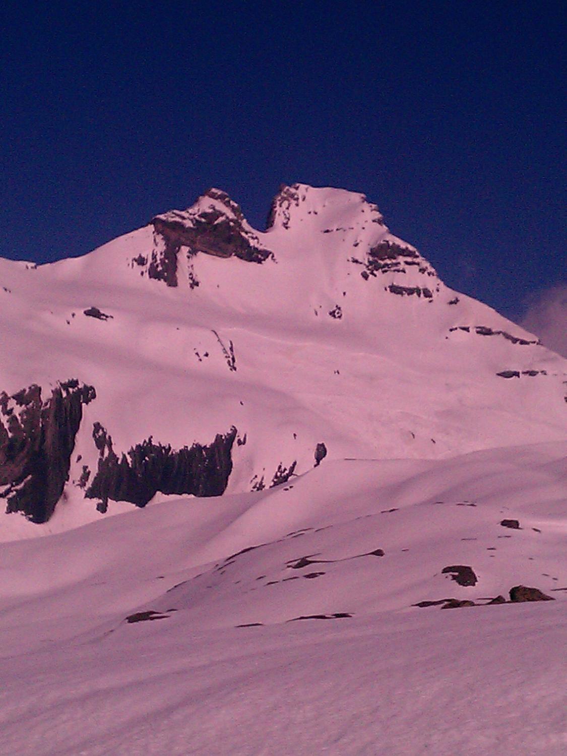 Neuschnee am Gipfel-Osthang zw. 2600 u. 3050 hm fast komplett vor wenigen Tagen abgegangen, viele Frühjahrslawinenabgänge durch Neuschnee.