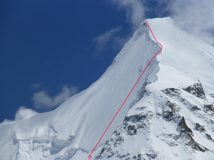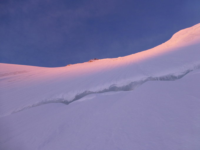 Schneeverhältnisse in der Wand waren zu zwei Dritteln pulvrig. Ausstieg auf den NW-Grat war dann von der Schneeauflage her dürftig (ca. 60 m Eiskontakt). Gipfelgrat herrlicher Pulverschnee. Abfahrt direkt vom Gipfel kurz über den Grat und dann weiter über Nordwand ins Becken. Bei der Blankeispassage wurde kurz gesichert. Randspalte lässt sich ohne Schwierigkeiten überwinden. Gletscher sind sehr gut überdeckt und problemlos gangbar, vorausgesetzt man ist früh dran. Beim Zustieg ins Gletscherbecken über die Steilflanke war der Schnee verhältnismäßig hart, aber kein Problem mit Steigeisen oder guter Kante. Kein Steinschlag etc. Hüttenzustieg zur Cabane du Mountet von Zinal über den Gletscher