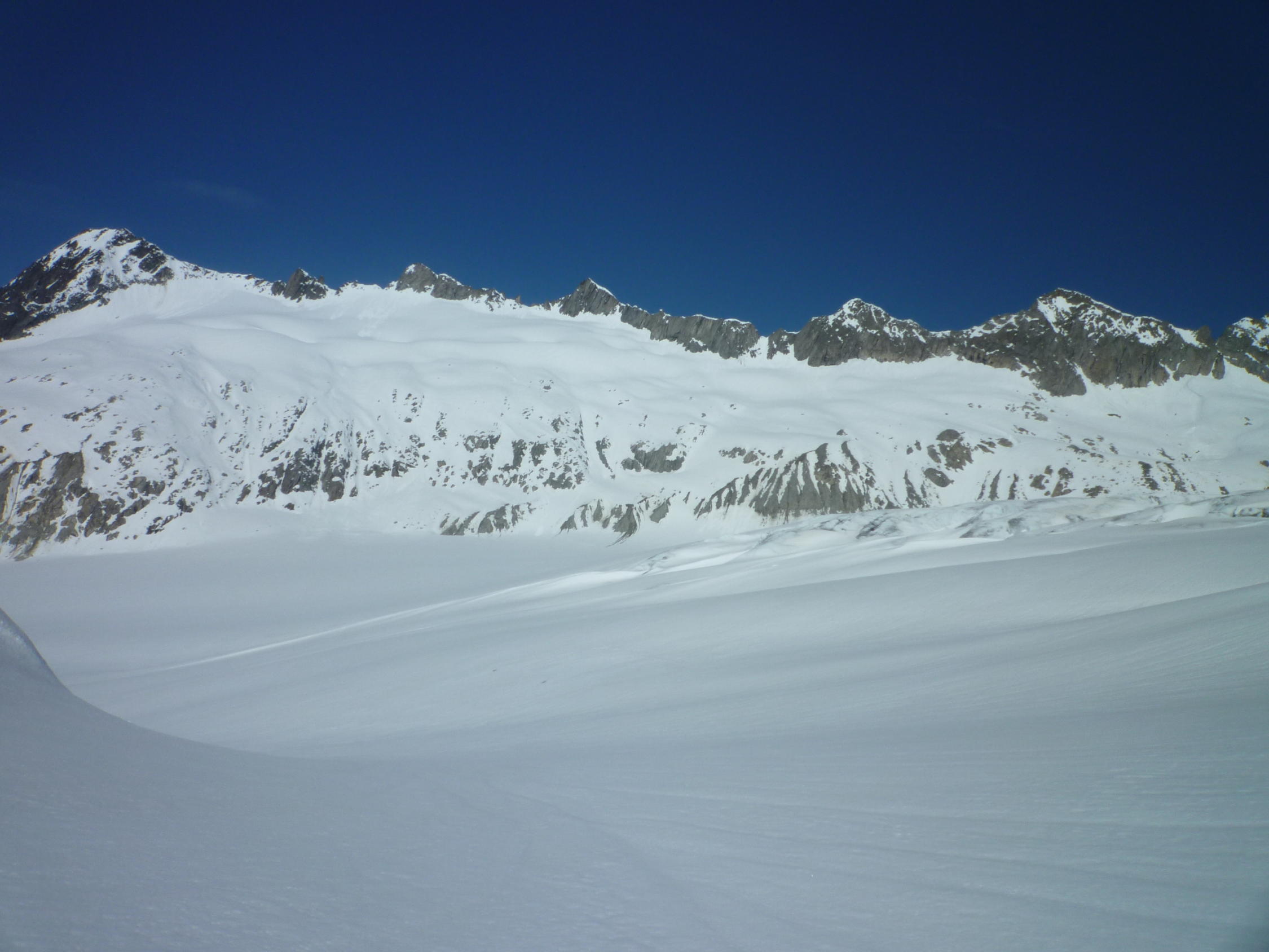 Gletscher noch gut zugeschneit, es hat noch sehr viel Schnee. Um 05.30 Uhr alles gut gefroren, bei Ankunft bei der Gletschergrotte kurz vor 10.30 Uhr unten schon ziemlich pflotschig.
