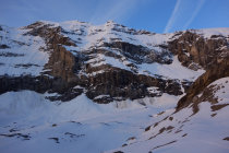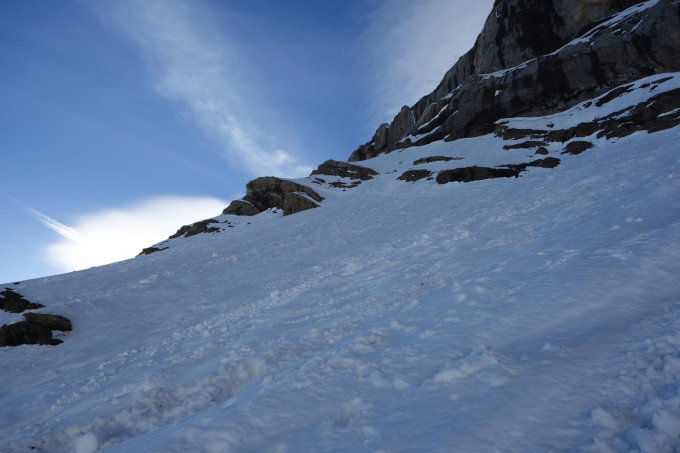 Alle Claridennordwand Aspiranten sind heute umgekehrt, da die Temperatur zu warm war. Bis zum Ende der Traverse wurde die Route geklettert. Es hat immer wieder Schneefelder, die aus 50cm hohem feuchten Sulz bestehen, der nicht durchgefroren ist. In vielen dieser Schneefelder sind die Frühlingslawinen noch nicht runtergekommen und entsprechend heikel sind sie im 50 Grad steilen Gelände.
