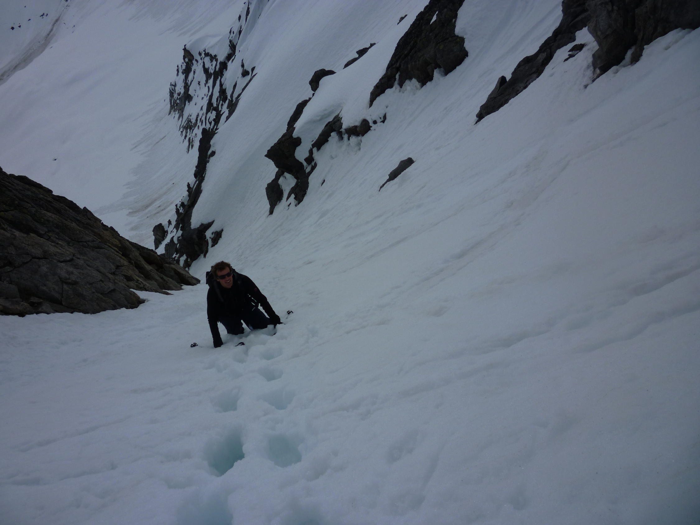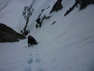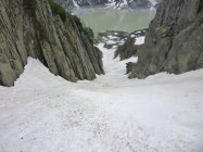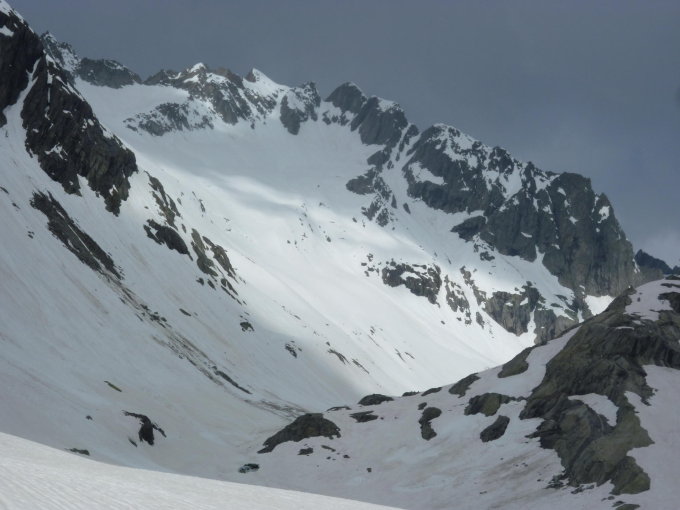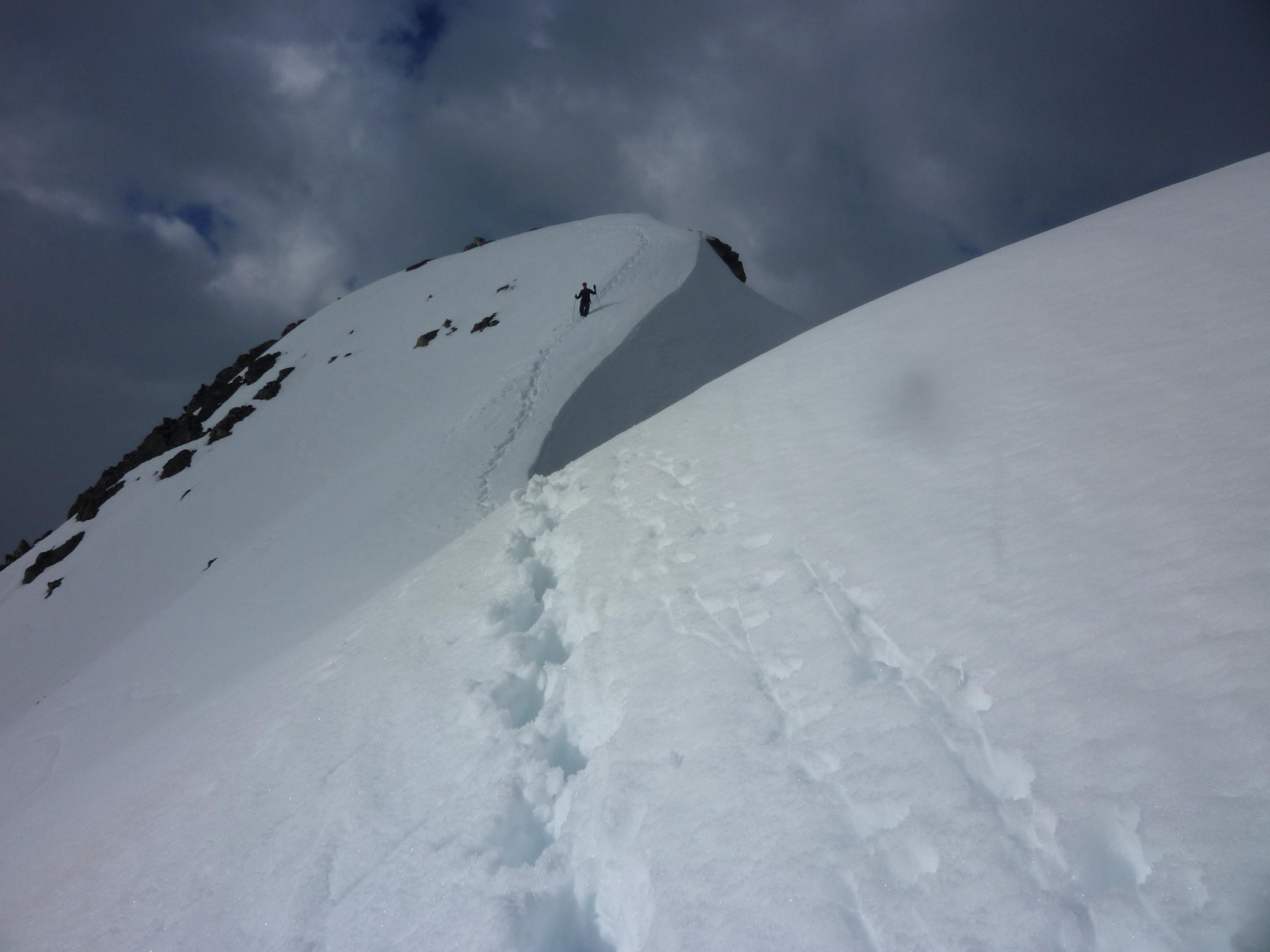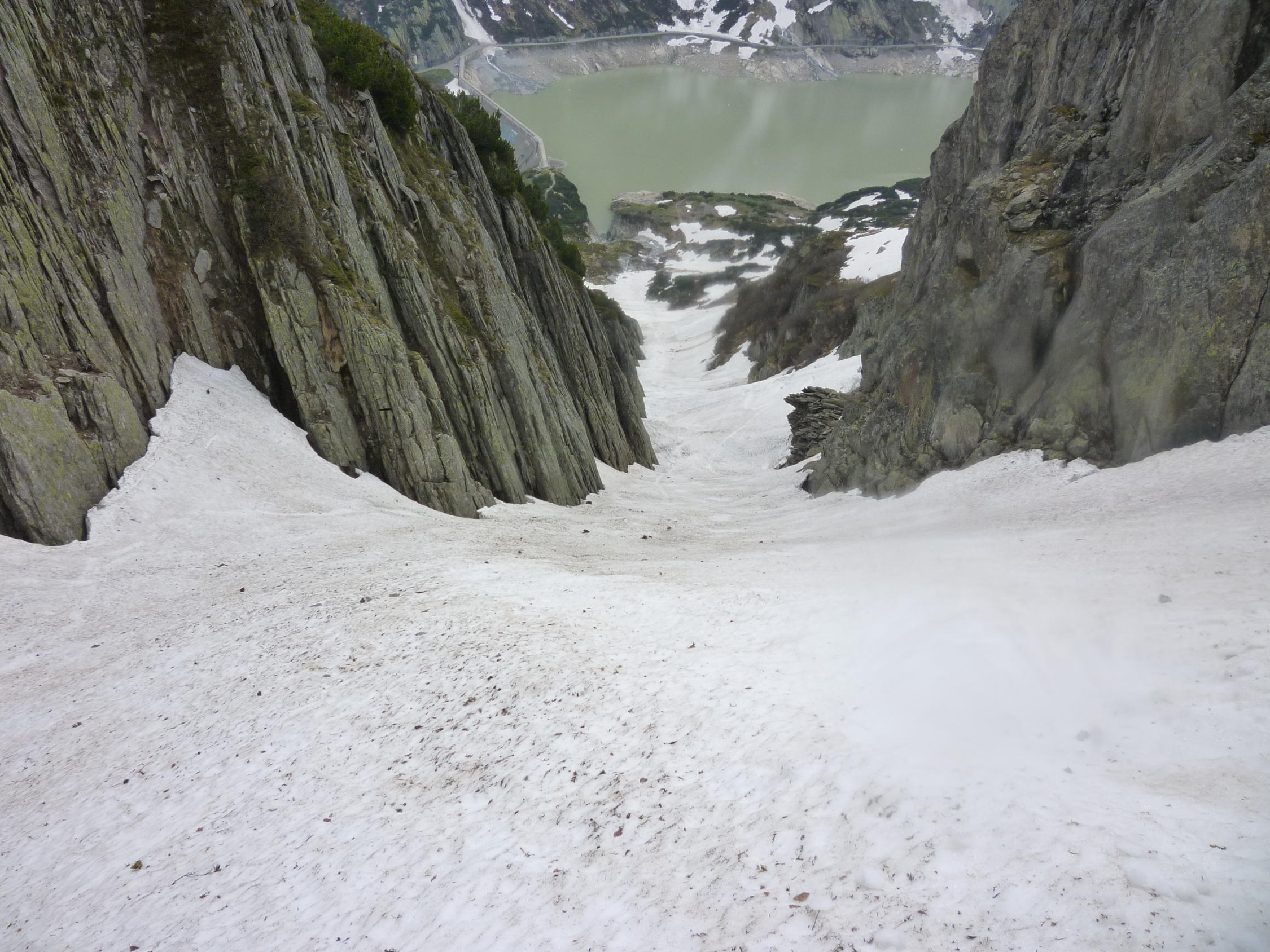 Schnee bereits um 4 Uhr sehr weich, +8°C. Ski können bereits direkt nach der Staumauer angeschnallt werden, das Couloir hoch "Ins Bächli" hat sehr gute Verhältnisse. Es empfiehlt sich, bereits bei P 2170 auf einem schwach ausgeprägten Rücken nach SW bis auf ca. 2450 m aufzusteigen und dann dem Gletscher unterhalb des Brandlammhorns aufsteigend nach W zu traversieren. Dies empfiehlt sich auch für die Abfahrt, die "Schiebestrecke" durchs Bächlital verkürzt sich dadurch. Die Gleitschneerisse im Hang gegenüber der Bächlitalhütte werden so oben umgangen. Im Couloir selbst aufgeweichter Schnee, alles eher mühsam. Vorsicht, der Bergschrund kommt langsam zum Vorschein, bei derart weichen Verhältnissen nicht unkritisch. Steigeisen wurden nicht benötigt