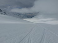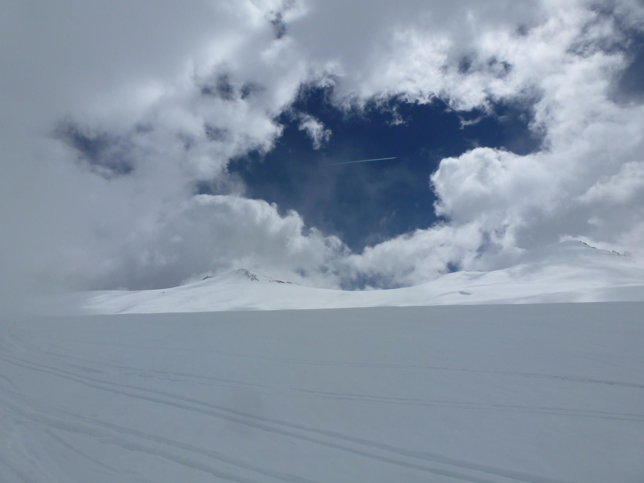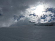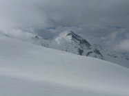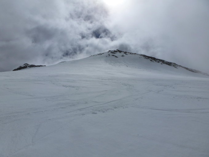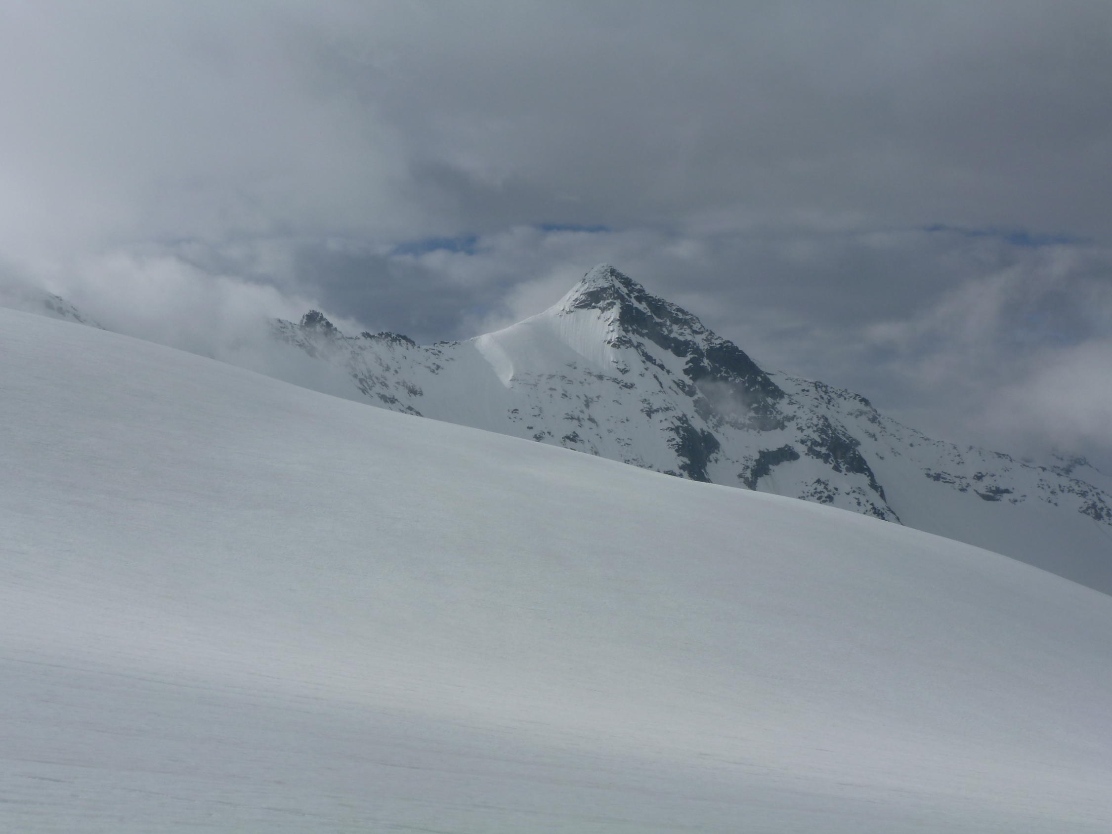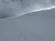 Schnee: infolge bedecktem Himmel kaum Abstrahlung. Temperatur um 04.30Uhr beim Belvedere +7Grad. Schnee nirgends gefrohren, nur im Gipfelbereich etwas Windgepresst. Bis auf ein paar kurze gute Phasen entsprechend mühsame Verhältnisse in der Abfahrt.