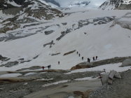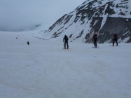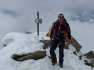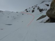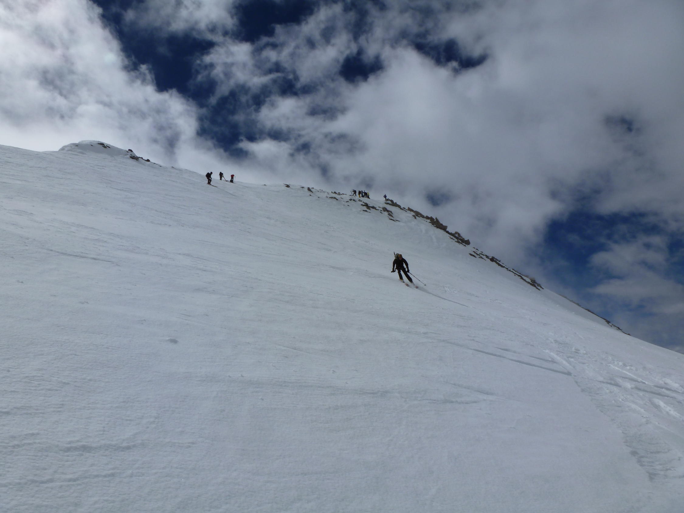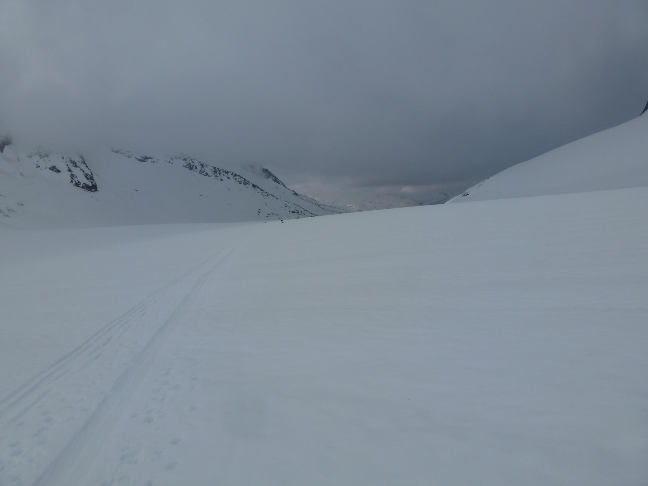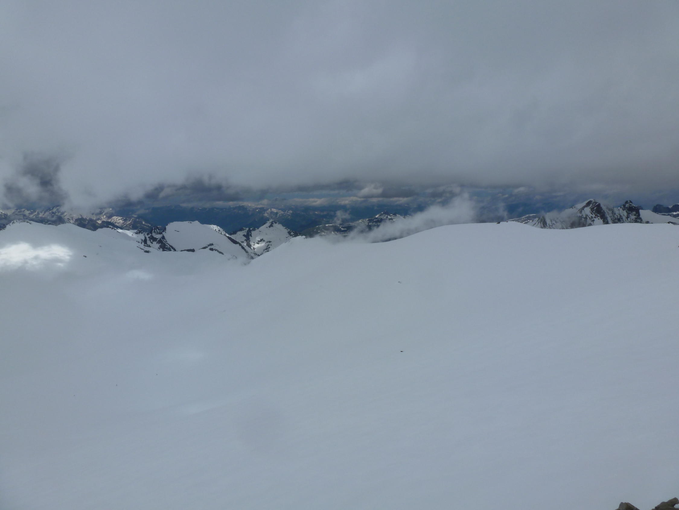 Schnee: infolge bedecktem Himmel kaum Abstrahlung. Temperatur um 04.30Uhr beim Belvedere +7Grad. Schnee nirgends gefrohren, nur im Gipfelbereich etwas Windgepresst. Bis auf ein paar kurze gute Phasen entsprechend mühsame Verhältnisse in der Abfahrt.