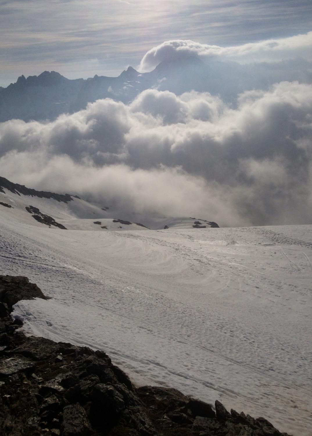 Sehr gute Verhältnisse, Neuschnee jetzt überall gesetzt, Abfahrt von Eiskuppe (ca. 3090m) ideal um 9.15h, Hang unter Lattenhorn ein Traum, noch genug Schnee bis zur Galerie.