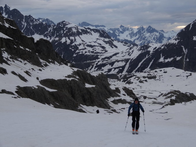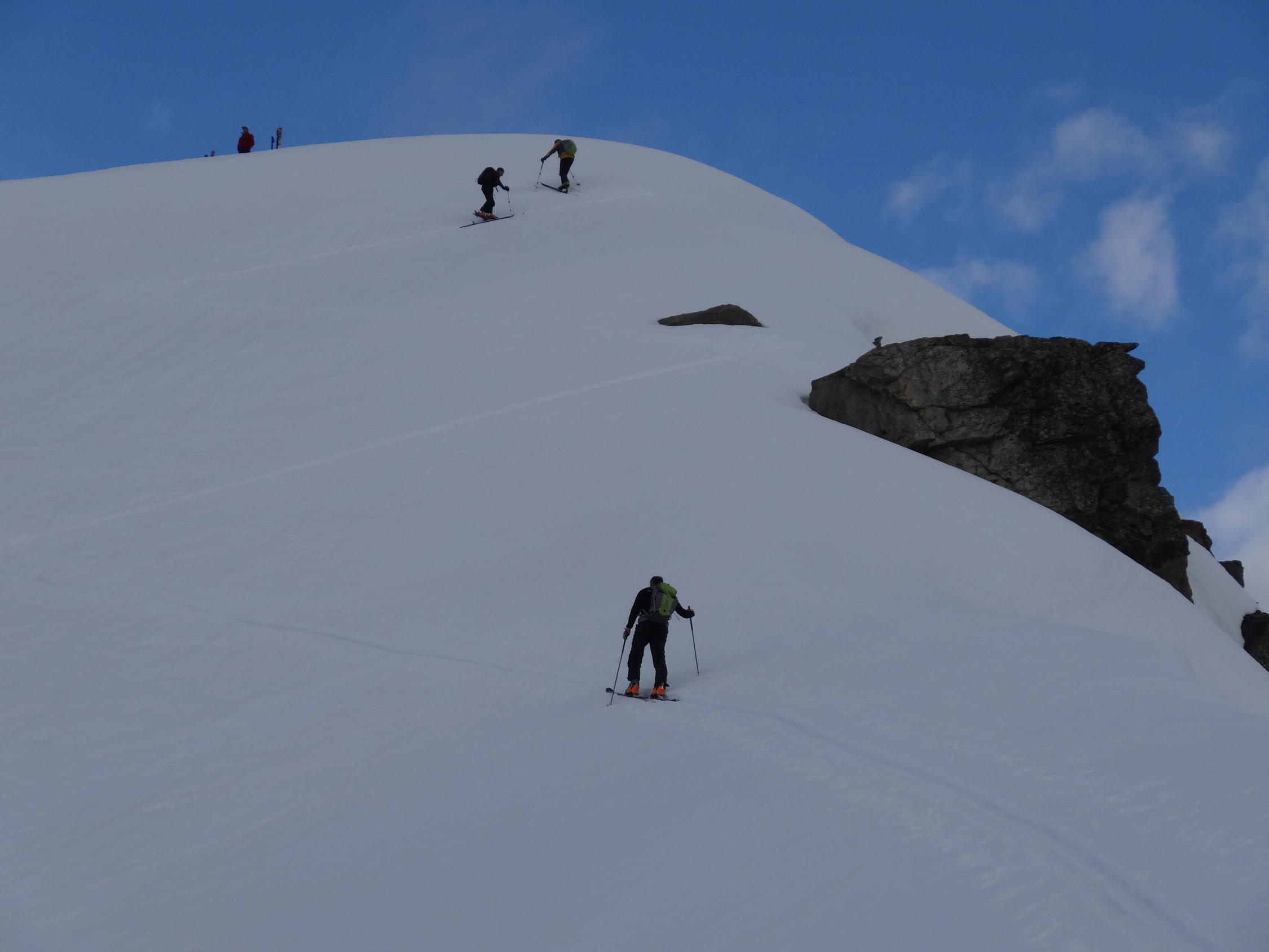 Start um 5.30 Uhr; Schnee bereits weich. Harscheisen nicht nötig. Spur vorhanden.Konnten noch bis zu den Autos (Parkplatz 2050 m) abfahren.