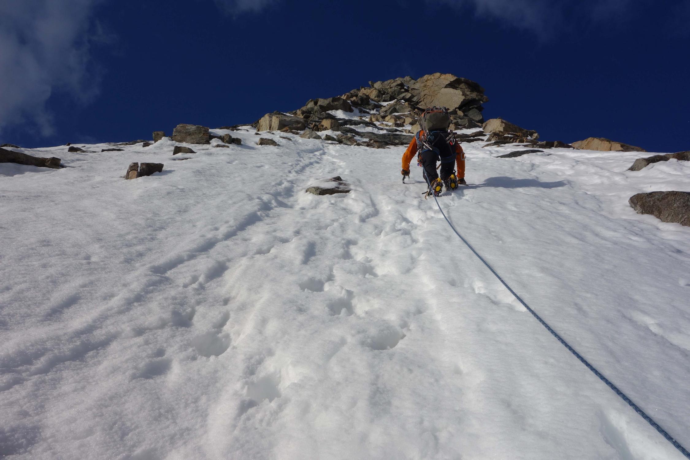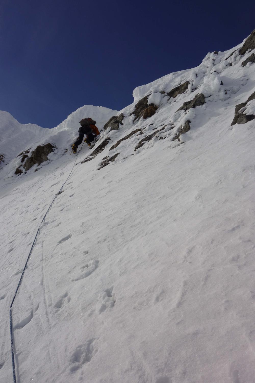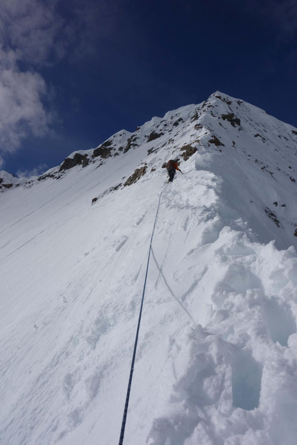 Route: Ziemlich gute Verhältnisse. Es hat sehr viel Schnee in der Route. Die Schneefälle der letzten Wochen sind verfirnt. Aufgrund der Wärme konnte die Schneedecke leider nicht gefrieren und war entsprechend weich. Teilweise einsinken bis zu den Knien. Die Felsen auf der Gratkante sind ebenfalls noch stark eingeschneit. Auf den letzten 20m des Ausstieges hatte es Blankeis.