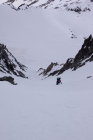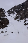 Zunächst 500 Hm Ski tragen, dann sehr gut gesetzter Schnee, im Couloir guter Trittfirn tlw. recht dünne Schneeauflage, seilfreie Begehung, Steigeisen Pflicht!