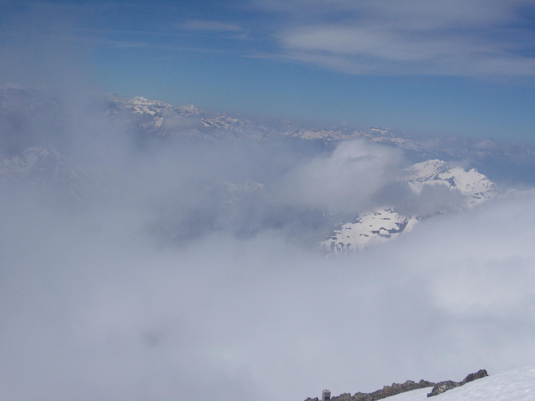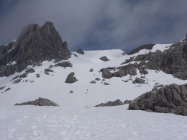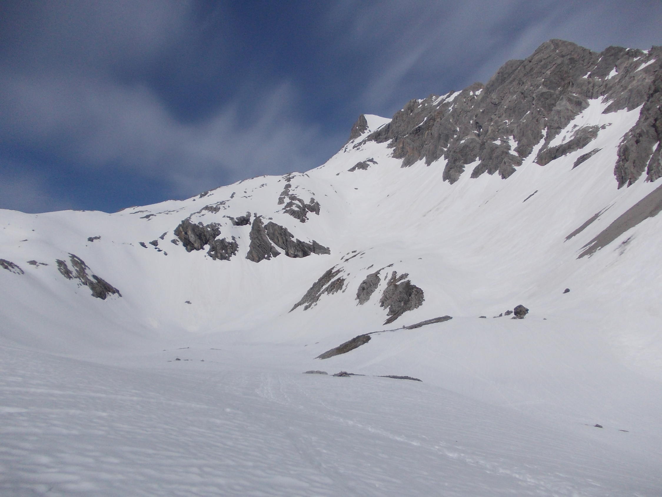 Aufstieg: Ab 2300m noch fast zusammen hängende Schneedecke. Die blau weiss markierten Weg Markierungen sind nur selten zu sehen. Es hat für die Jahreszeit noch sehr viel Schnee, 1m - 2m. Es ist eine gut ausgetretene Spur vorhanden.