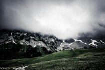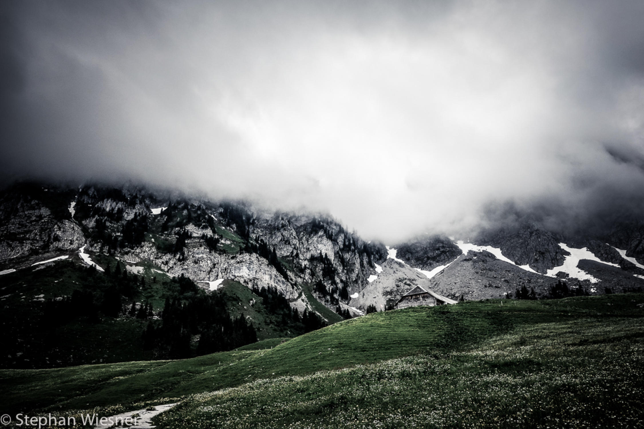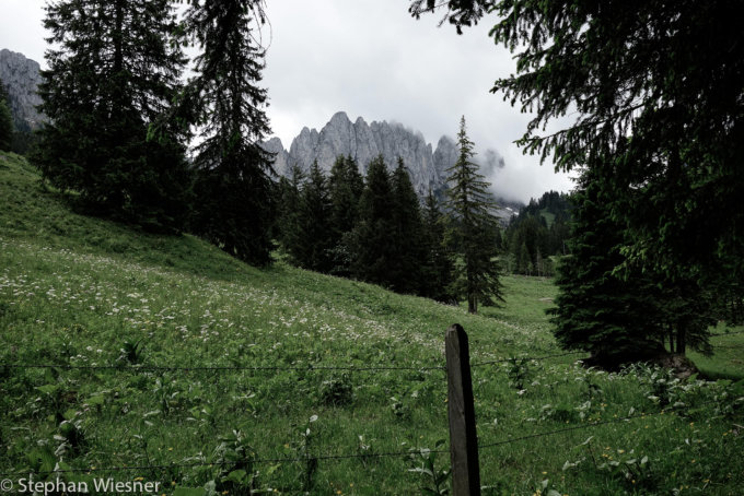 Dichte Wolken, so dass wir nicht sehen konnten, wo der Schnee losgeht. Erste Schneefelder an schattigen Stellen ab 1600m :-(