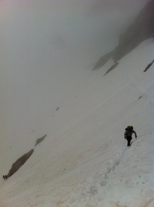 Schnee schon vor der Blüemlisalphütte. Spuren im Schnee erleichtern das Wegfinden. Hütte ist gut erreichbar. Etwas mehr Zeit einplanen. Viel Schnee bis zum Klettereinstieg. Wind aber schön!
