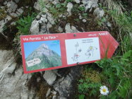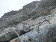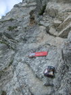 Dort kam mir ein Kletter-Pärchen entgegen. Wer so spät diese Tour durch die Nordwand beginnt, bekommt noch etwas Abendsonne ab. Ich war nicht der einzige, der so dachte. Ein Vorsteiger weit vor mir trat Unmengen kleiner Steine los. Von dem Zeugs liegt allerdings dermaßen viel auf den Felsbändern und in den Rinnen rum. So daß der Helm in der Tat auf dieser Tour ein Schutz dagegen ist. Diesen Hinweis kann man auch dem Cartoon auf blauem und rotem Pfeil-Schild am Einstieg beider Routen entnehmen.