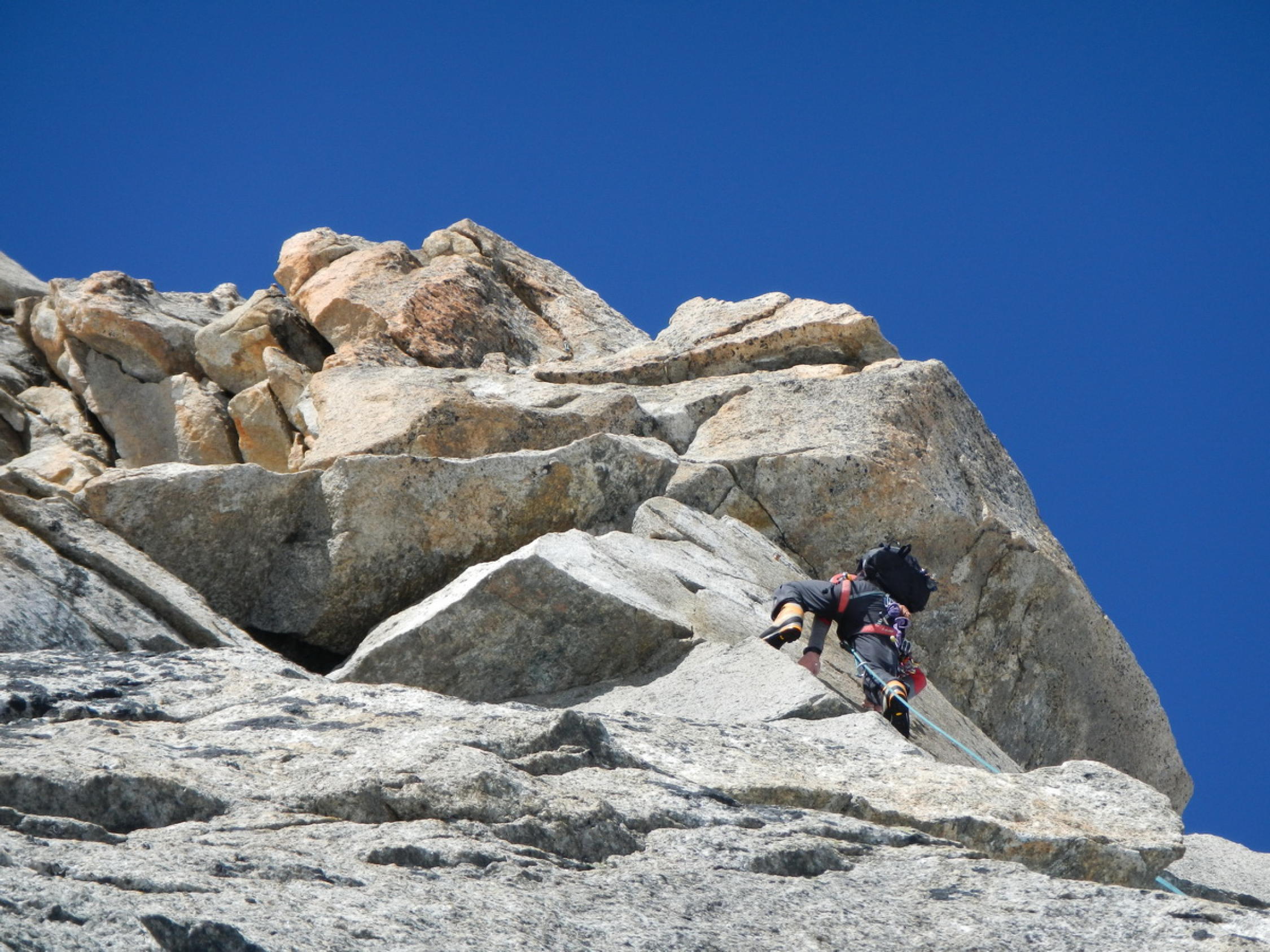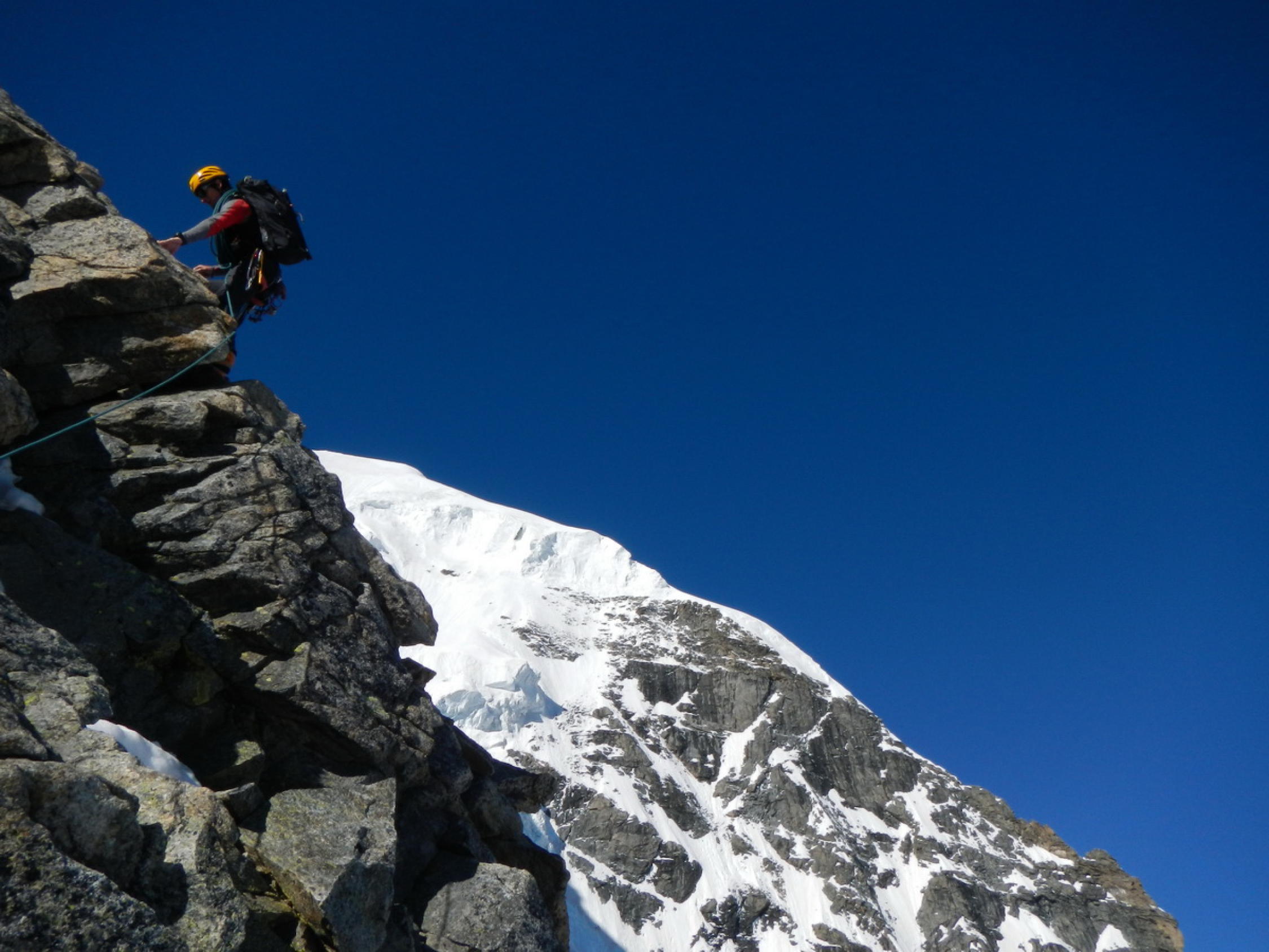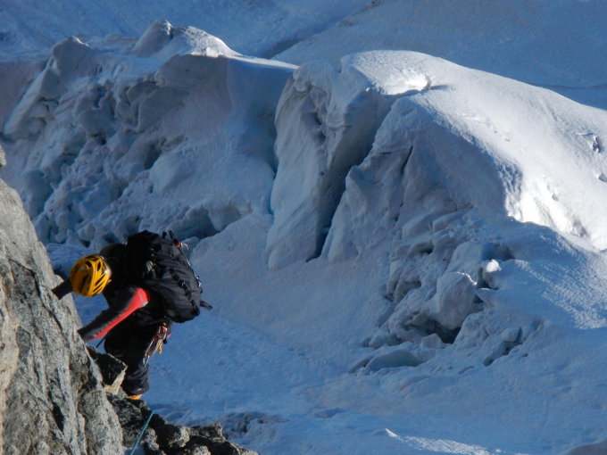 Eigentlich perfekte Verhältnisse: Der Grat ist weitgehend schneefrei, die Felsen trocken. Erst im oberen Viertel des Felsgrates liegt hin und wieder fester Trittschnee auf der Gratschneide. Der Firngrat weist hat perfekten, festen Trittschnee und kein Blankeis auf.