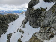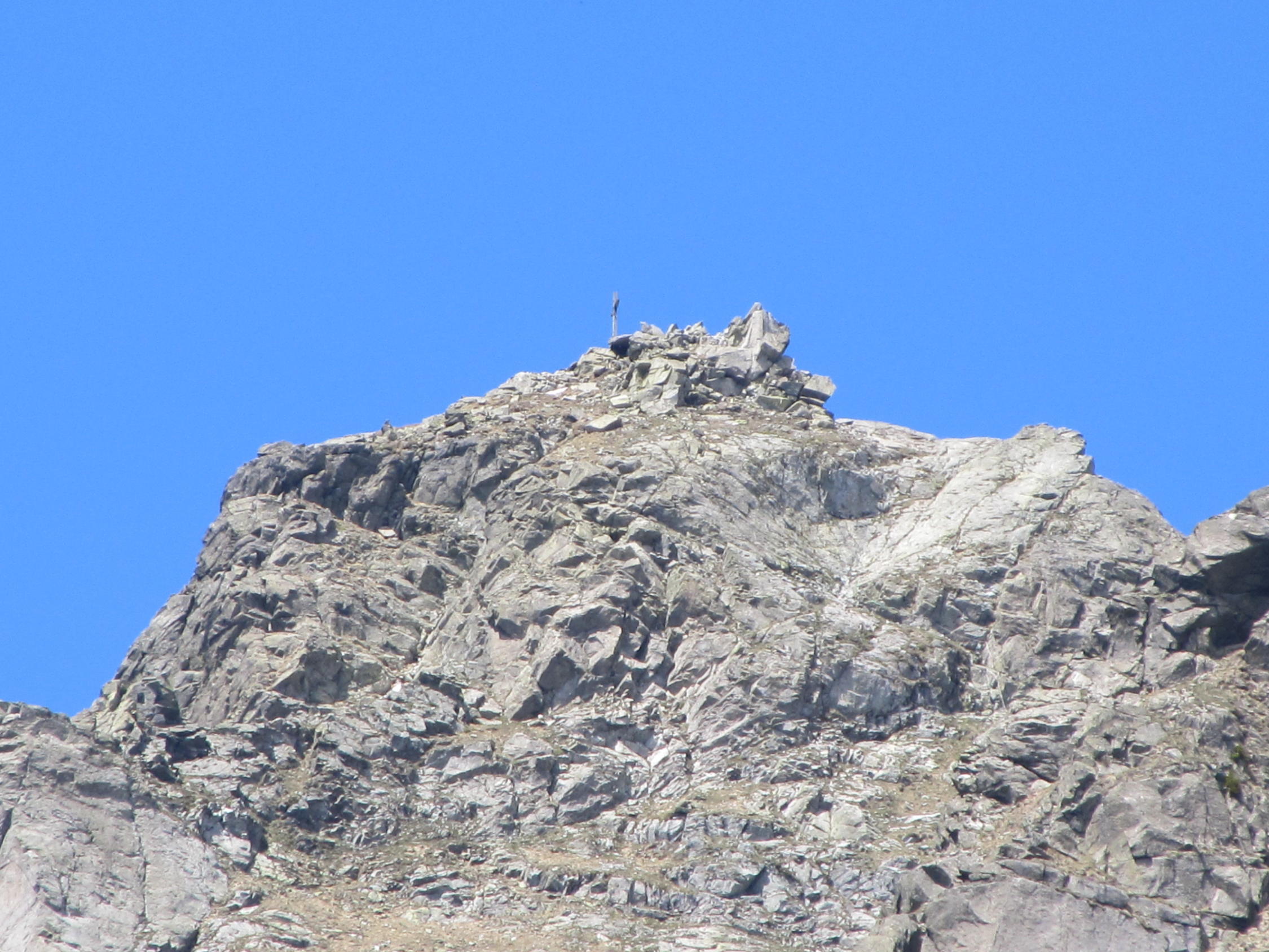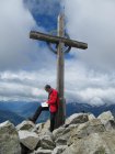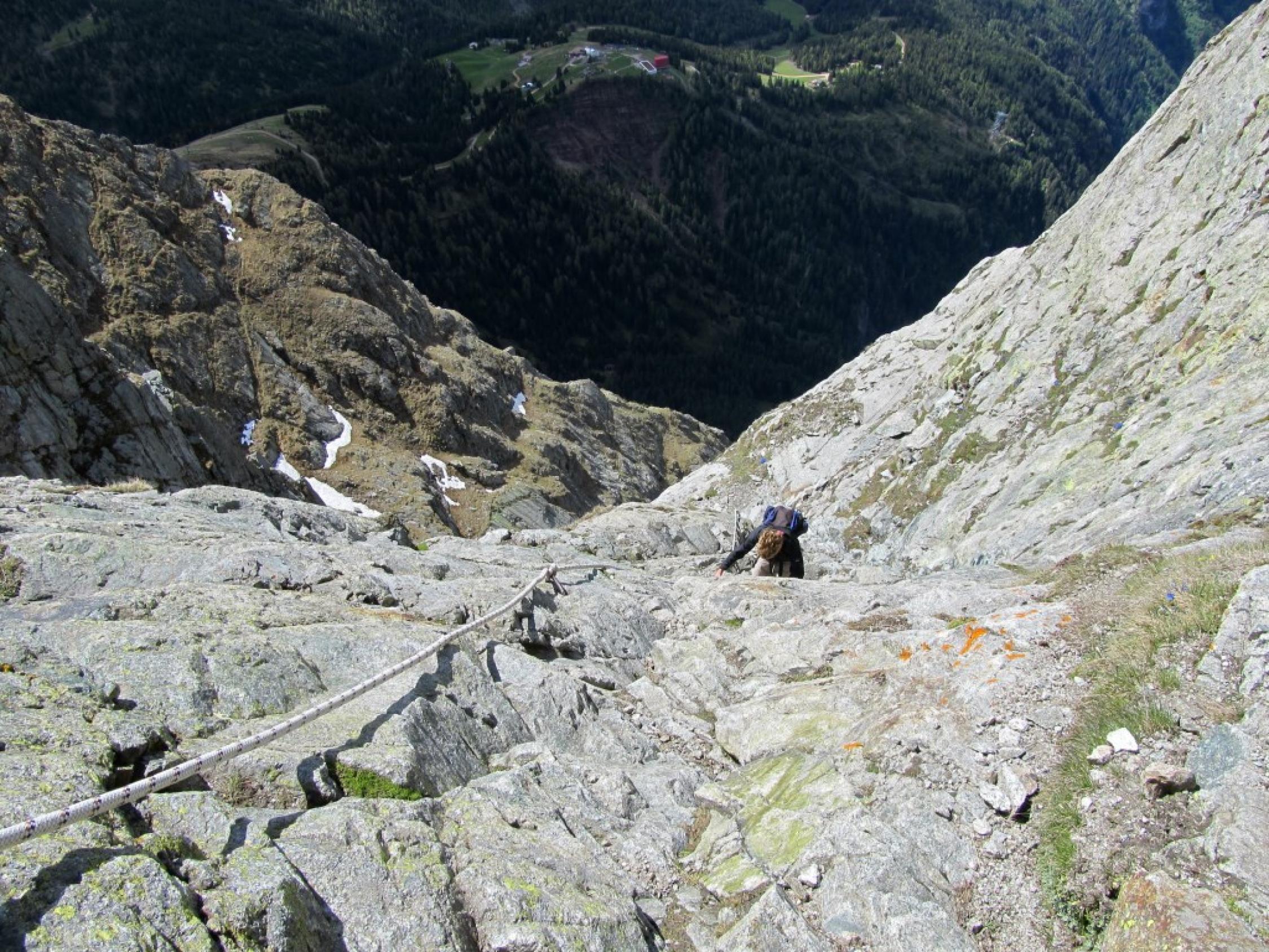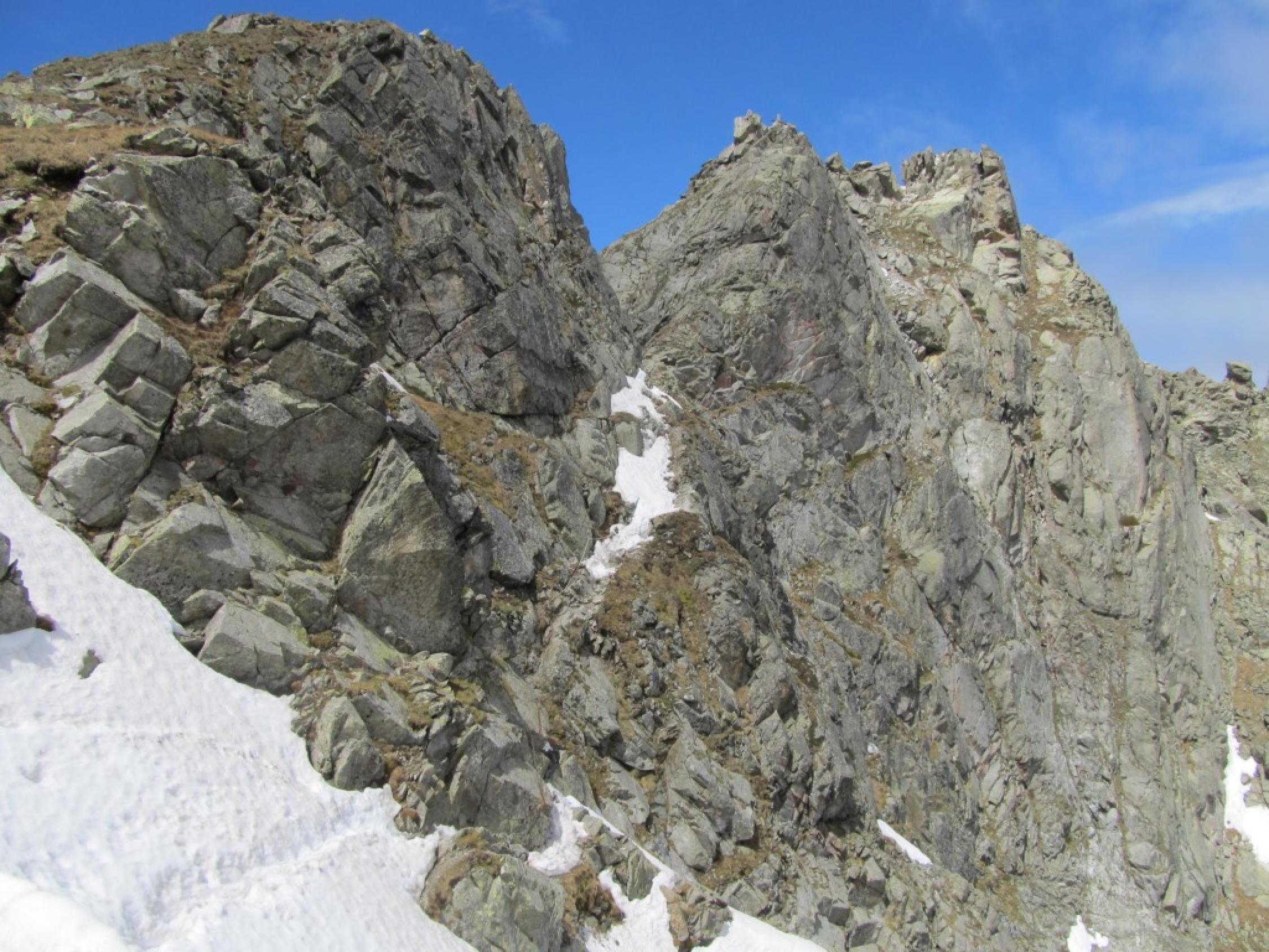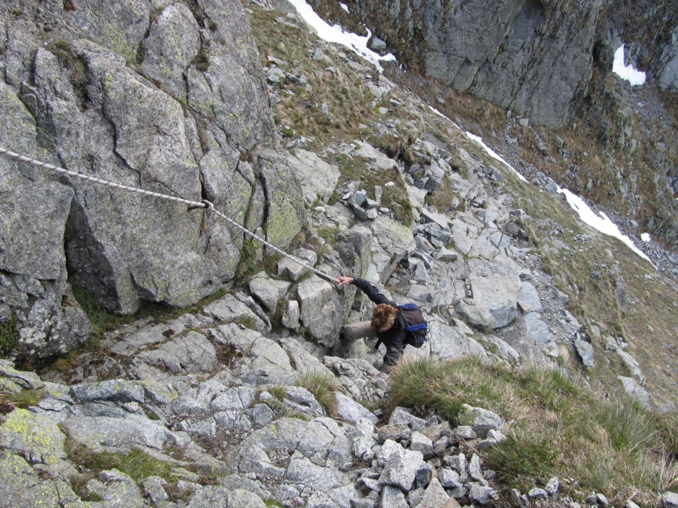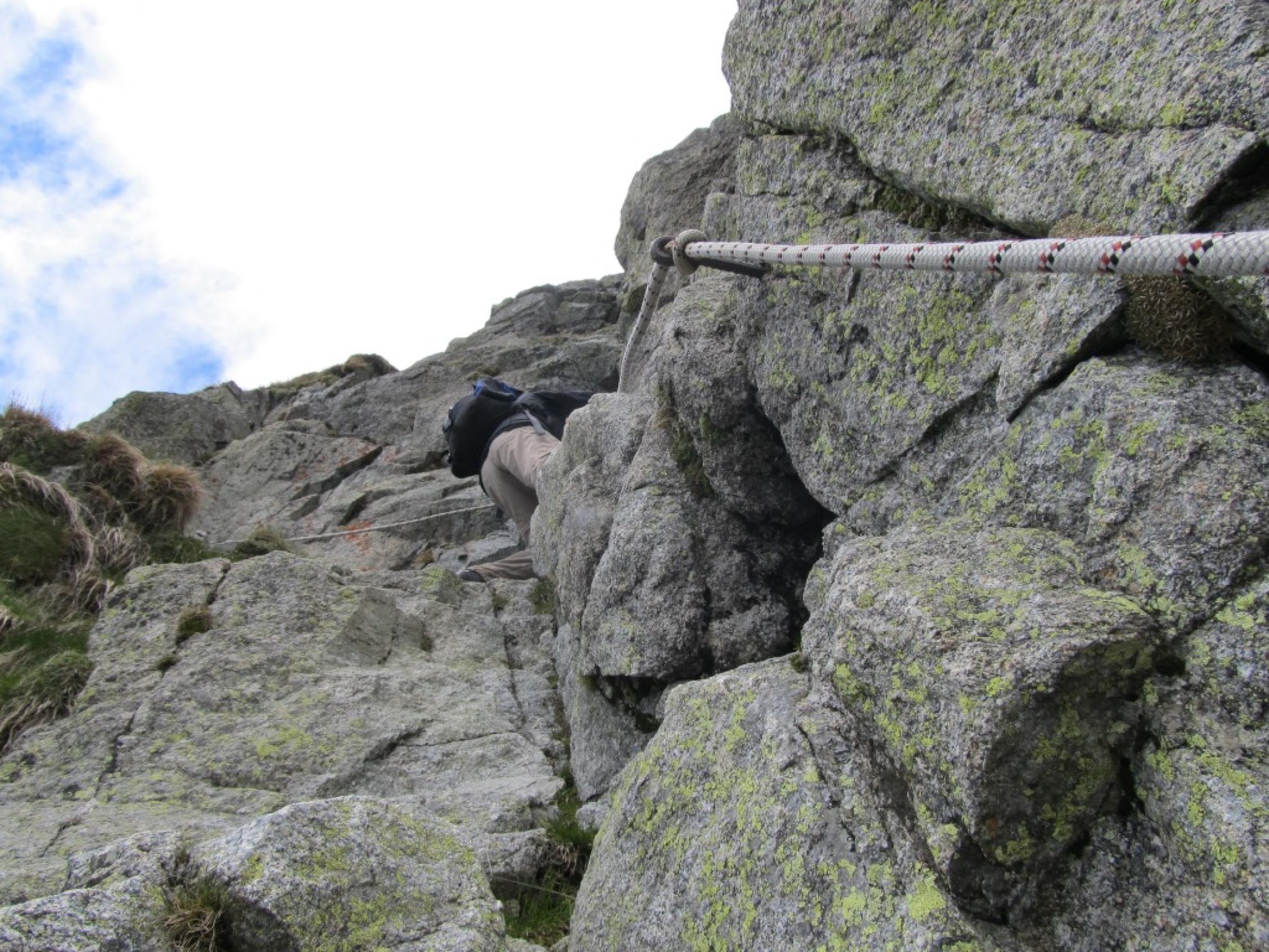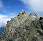 Wetter trocken, teilweise bewölkt. In der erwähnten, steilen Rinne lag noch Schnee, der wenig verfestigt war und man so teilweise eingebrochen ist. Die folgende Kette/Seil war teilweise noch unter Schnee versteckt, was erhöhte Vorsicht bedeutete, auch weil unter den Schneerändern eine Eisschicht vorhanden war. Am Gipfelkopf südseitig war ein Wändchen ca. 4 m hoch zu durchsteigen II-. Nach einer Querung folgte eine plattige Felspassage (Seil). Die letzten Meter über Felsblöcke zum Gipfelkreuz. Die Passage über den südseitigen Gipfelkopf ist recht exponiert. Bei Nässe ist der Aufstieg zum Großen Ifinger nicht zu empfehlen.