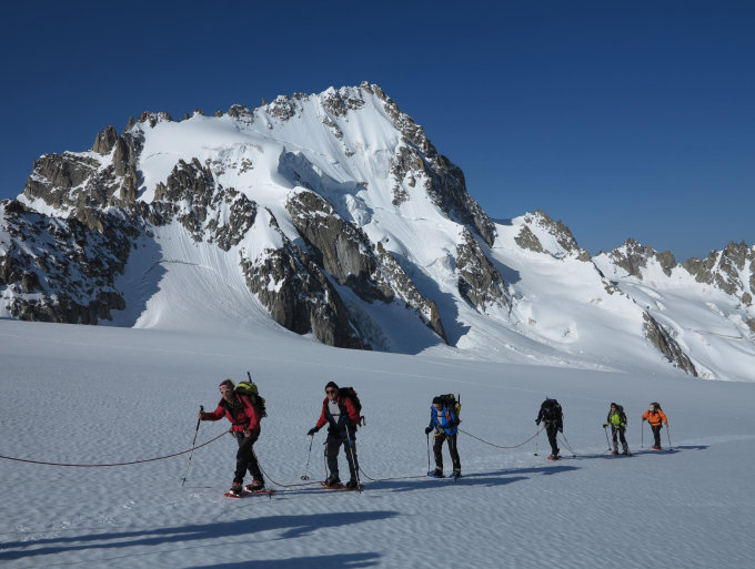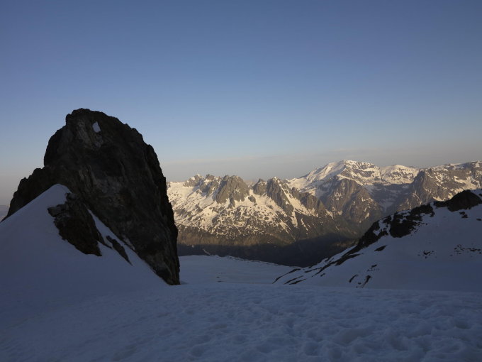 Trotz sehr heissen Temperaturen Trittschnee und bereits viele Anstiege gut gespurt im Trient Massiv. Praktisch keine Spalten sichtbar. Markantes Schneebrett im zentralen Teil des Col Blanc.