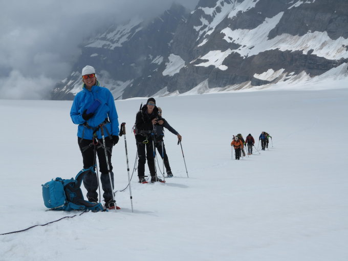 Gut eingeschneite Gletscher. Die günstige Schneelage erleichtert vor allem den Abstieg bis zum Spalihorn. Der Schnee ist aber weniger gut verfestigt als auf den vorherigen Touren im Trient Gebiet und am Wildstrubel. Schneeschuhe sind hier immer noch von Vorteil.