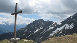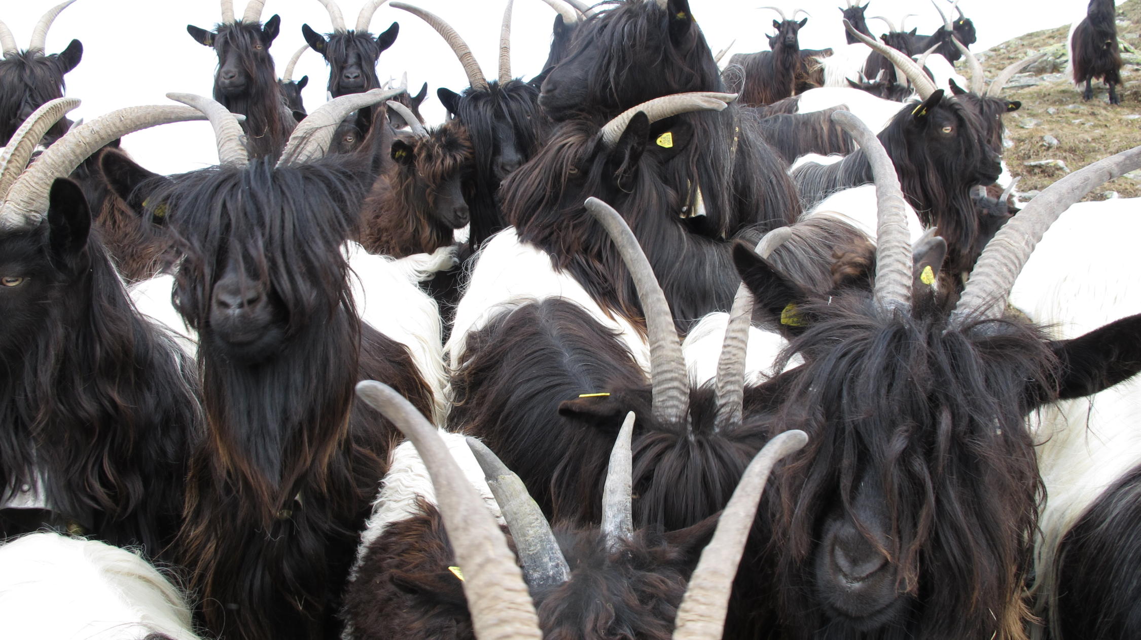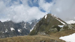 Auf dem Grat wurde ich von einem Rudel Schwarzhals Ziegen übermütig begrüsst. Sie umringten mich derart, dass ich kaum noch gehen konnte. Das Leittier versuchte mich immer abzudrängen. Erst ein steiles Firnfeld erlöste mich, hier trauten sich die Geissen nicht weiter....