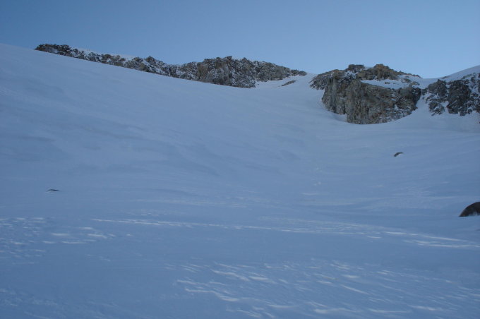 Rohnegletscher immer noch gut eingeschneit der Neuschnee schon Hartgefrohren.Gipfelhang verblasener Pulverschnee gut für Anlegung für Spur.Gipfel windstill aber kalt leichte Nebelbänke am start der Tour