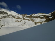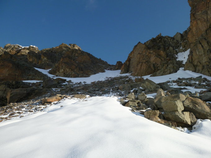 Im Couloir bis zur Scharte guter Trittschnee. Couloir 40 - 45° steil.