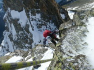 Kurz nach der Scharte auf etwa 20 - 30 Klettermeter Wassereis angetroffen, heikel. Es liegen in diesem Bereich viele lose Steine auf den Bändern.
