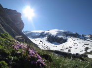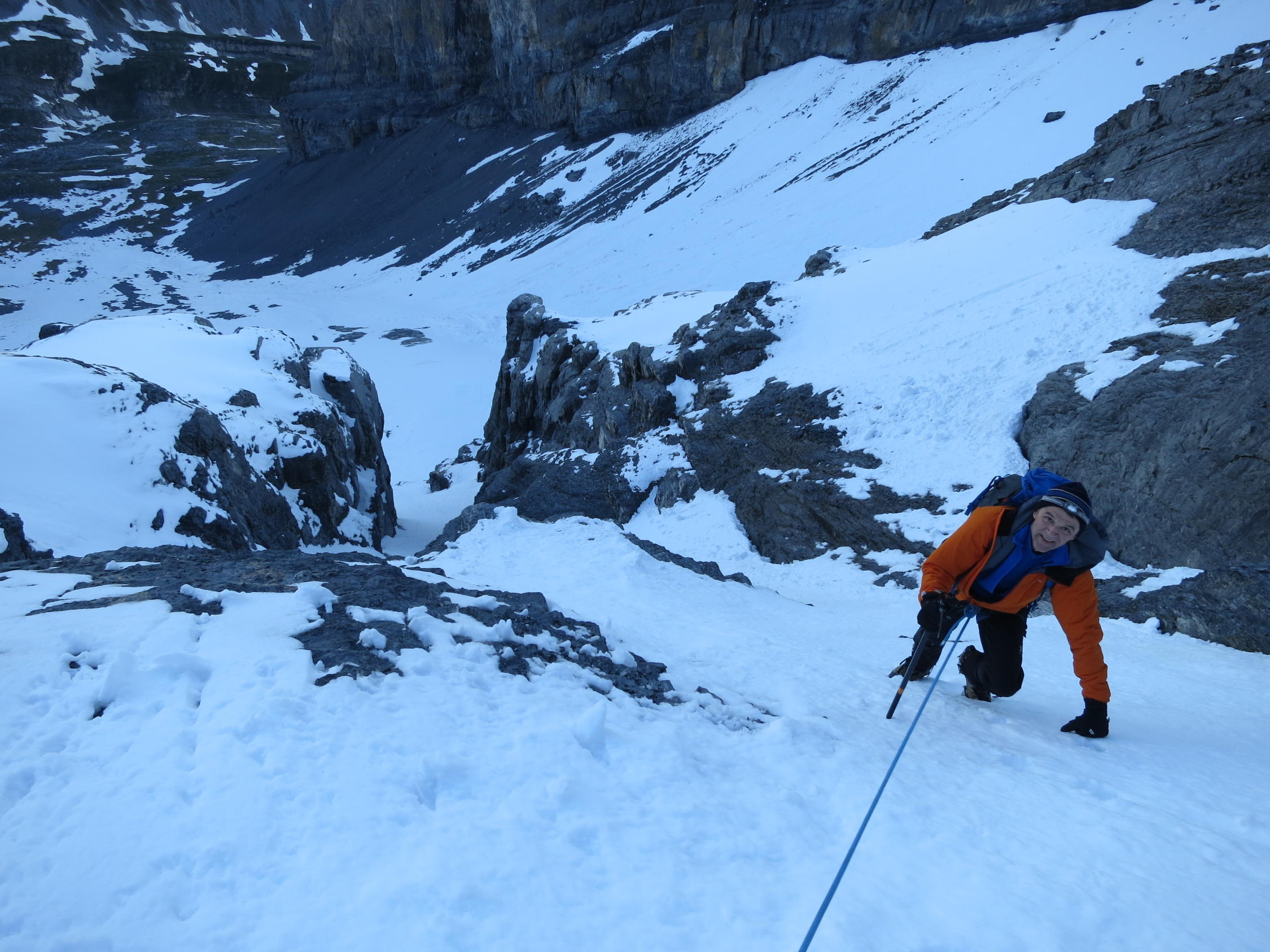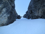 Guter Trittschnee von 2300m bis zum Gipfel. Im Couloir sehr viel Schnee.