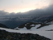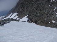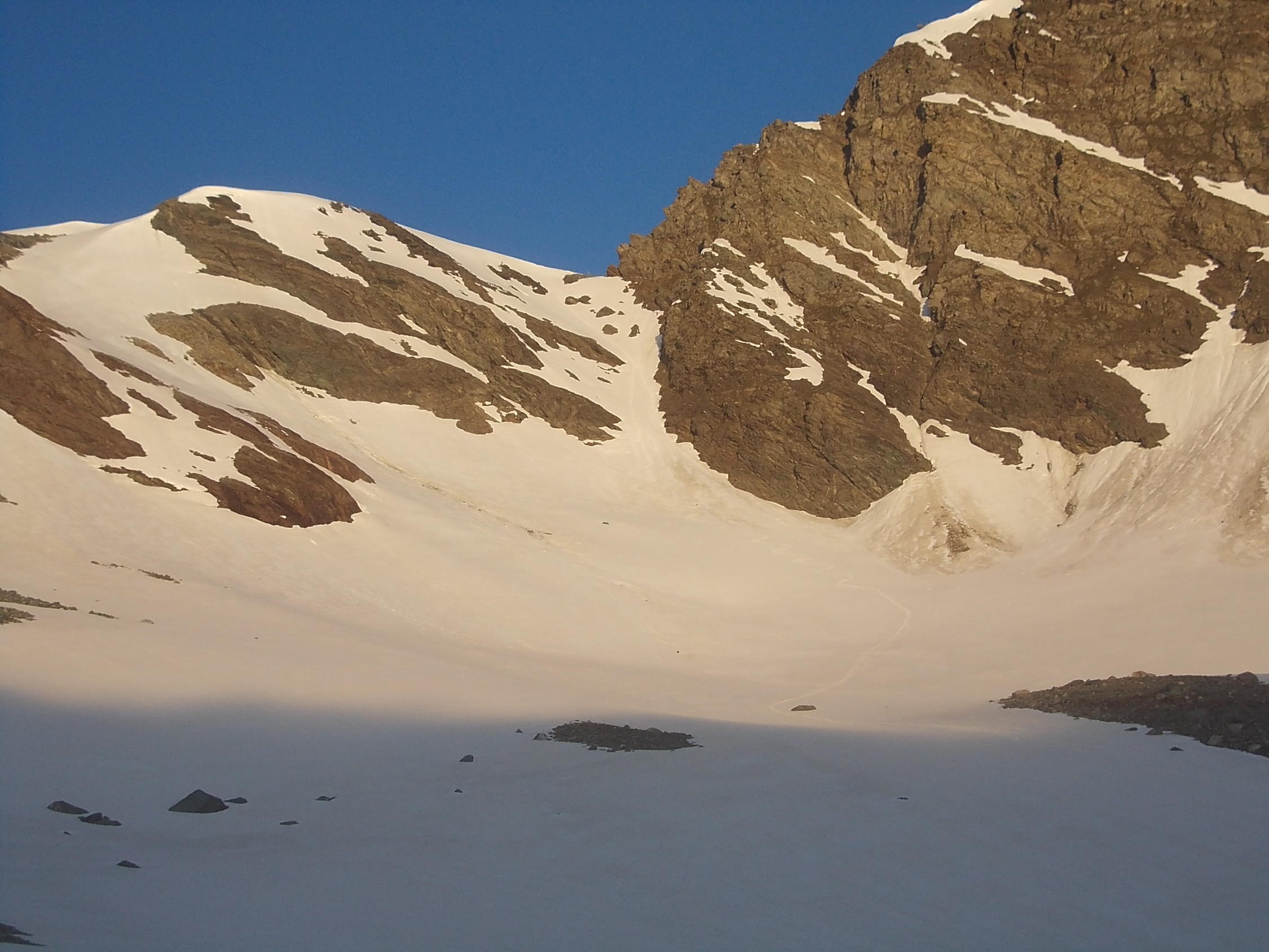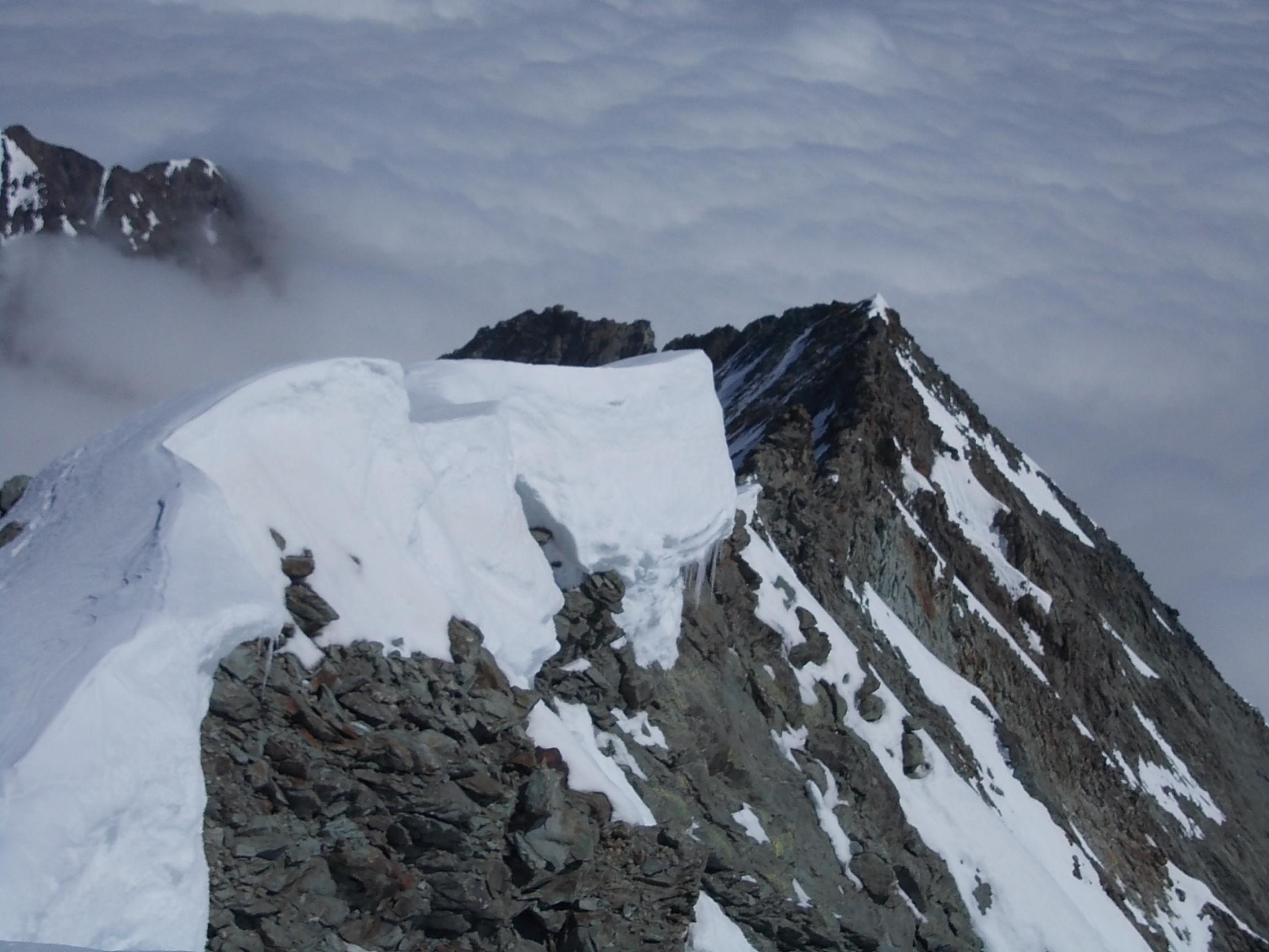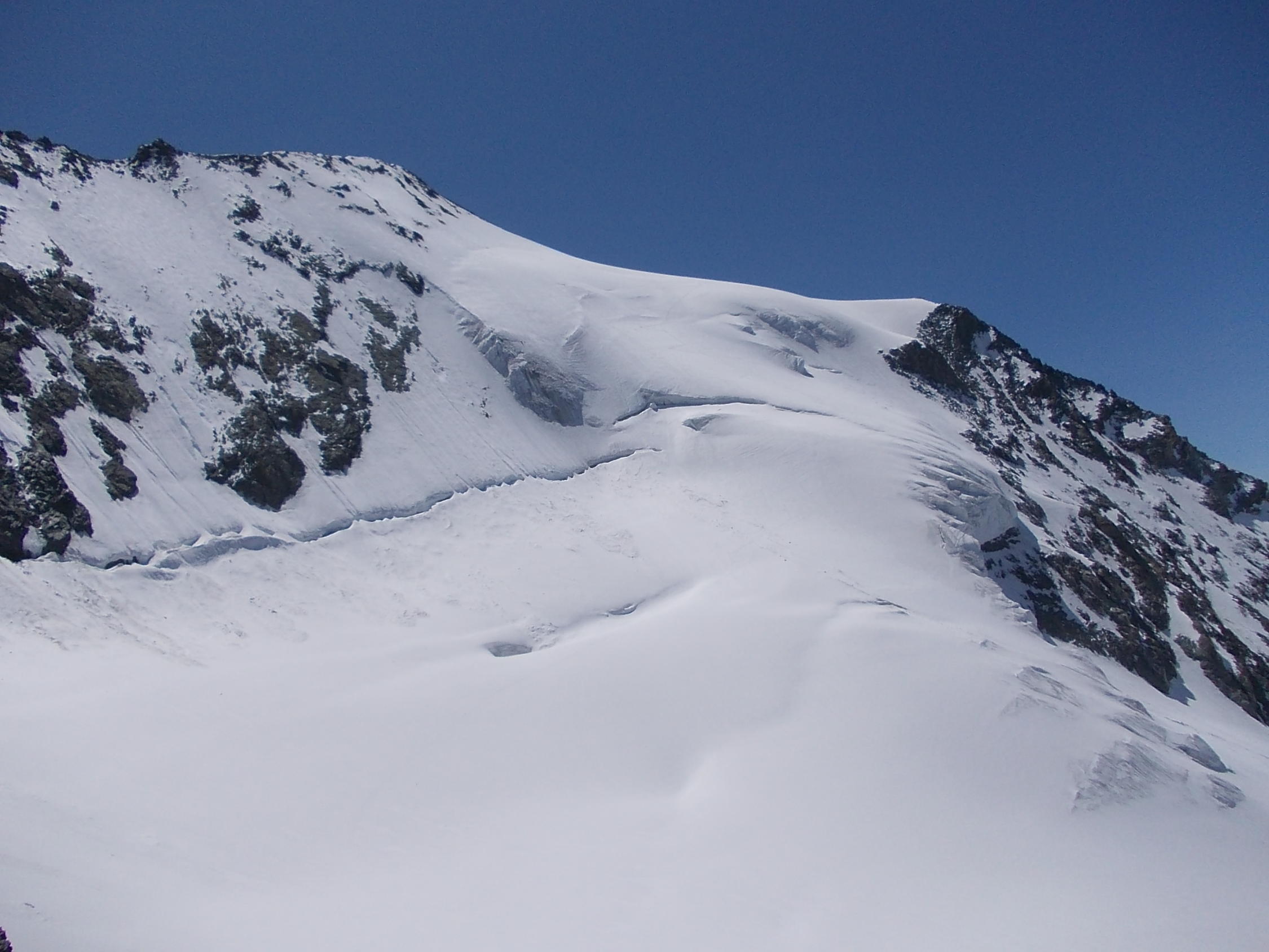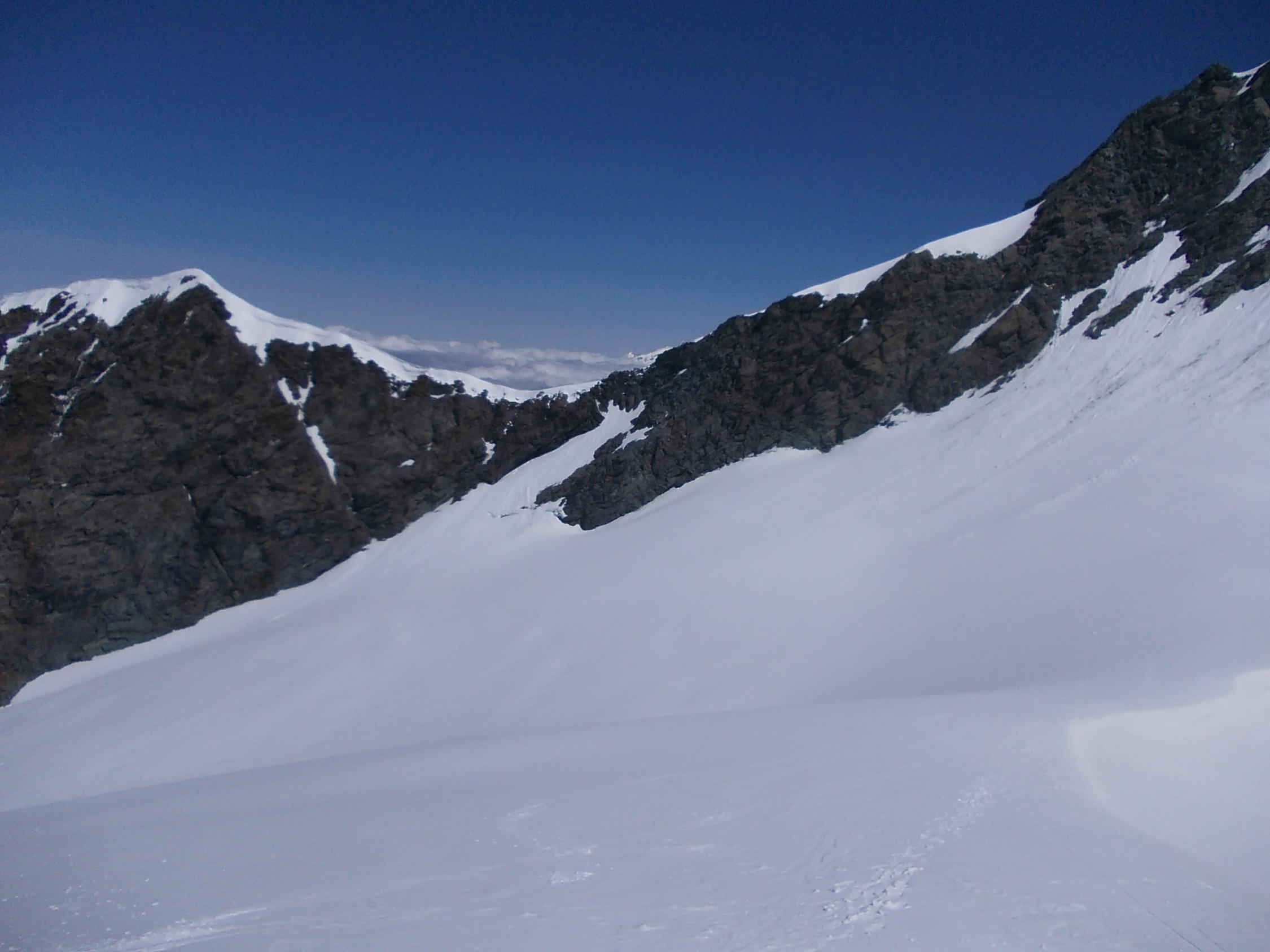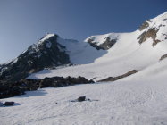 Mit zunehmender Erwärmung wird die Gletschersituation sicherlich nicht besser. Das Couloir hinauf zum Grand Col könnte dann eventuell auch steinschlägig werden. Auch der derzeit noch gute Bergschrund wird wohl zusehends schwieriger werden.
