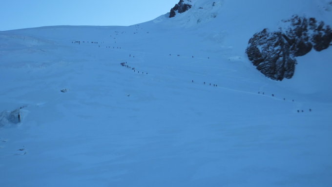 Aufstieg über Schwarzhorn (4322), Ludwigshöhe (4341) und Parrotspitze (4432). Abfahrt von der Parrotspitze ins Seserjoch und Aufstieg zur Margherita.
