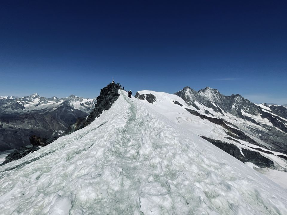 Ab der Piste im Sommerskigebiet führt eine gute Spur in mehreren Kehren hoch aufs Feejoch, der grosse Spalt lässt sich leicht überqueren, und bis zum Übergang in den Fels waren es herrliche Trittfirn Verhältnisse. Der Gipfelgrat war bereits etwas weich, und dies merkte man dann auch auf den letzten 300 Metern im Abstieg. Die Spur wurde weich, und links war es doch relativ steil. Sicheres gehen auf Steigeisen ist gerade auf den letzten Metern essenziell.
