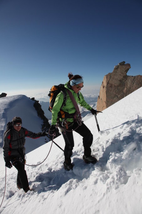 Perfekter Trittschnee, die Gletscher sind optimal eingeschneit. Die Felsbarriere lässt sich trotz Schnee gut klettern. Grosse Trittlängen in der Spur, da eine Seilschaft über den Grat abgestiegen ist.