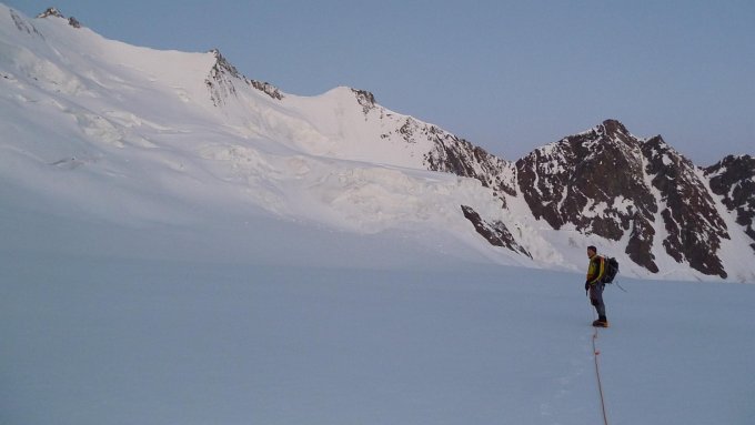 Verhältnisse am Grat dürften so bleiben. Der Firm auf dem Gletscher weicht Nachmittags schon stark durch. Man sollte sich daher mit seiner Tour beeilen. Wie lange die guten Bedingungen im Couloir aufgrund der Erwärmung noch anhalten ist ungewiss.
