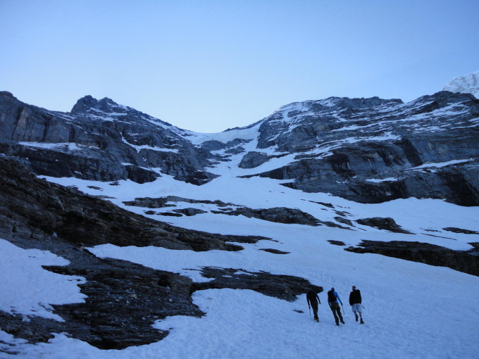 Fast kein Schnee mehr. Vom Eigergletscher bis Rotstock Schneefrei, ab da hätte es genügent Schnee aber leider nur noch Lawinenschnee, ab Eisabbruch wäre der Schnee fahrbar gewehsen aber leider gerade unterhalb des Eisabruches Wassereis und ein kleiner Wasserfall beim Aufstieg kein problem aber für die Abfahrt kein genuss.