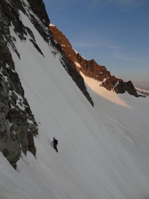 Im grossen und ganzen dann gute Verhältnisse in der Wand. Bis zum Felsriegel harter Firn (= Frontzacken, keine Spur ersichtlich). Die erste Traverse kurz nach dem Einstieg ist momentan fast die heikelste Stelle. Diese apert langsam etwas aus. Felsband dann momentan ziemliche Mixed. Sind alles mit den Eisgeräten geklettert. Ging einfacher als sich mit den Händen an den mit Eis überzogenen Felsen festzuhalten. Obenraus dann sehr guter Firn bis ca. 150 m vor Aussstieg. Dort kommt das Blankeis sehr nahe und wir haben daher zu sichern begonnen.