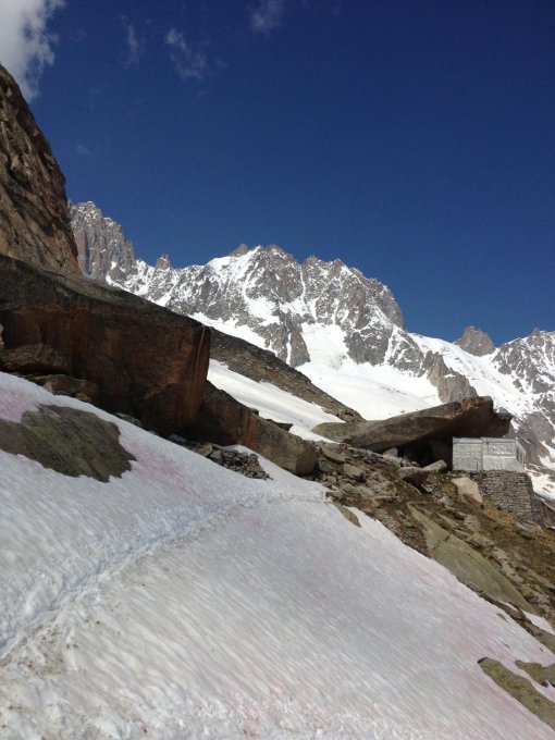 Nachts bewölkt und etwas Regen, daher keine Abstrahlung und entsprechend eingesunken. Mühsames Gegrabe wechselnd mit etwas härteren Passagen das Couloir hoch, im Mixed Teil dann viel Wassereis. Gut mit Friends absicherbar, Routenführung nicht immer einfach. Gipfelgrat ok, Abseilen mit 2x60m zügig möglich. Der nachfolgende 40 Grad Hang runter zum Glacier de Talèfre war dafür dann sehr heikel, da komplett durchweicht und Hang noch nicht unten, hier passieren auch öfters mal Unfälle. Es liegt noch sehr viel Schnee im Gebiet und da kann auch noch etwas runterkommen. Grate teilweise noch stark verwächtet und verschneit.