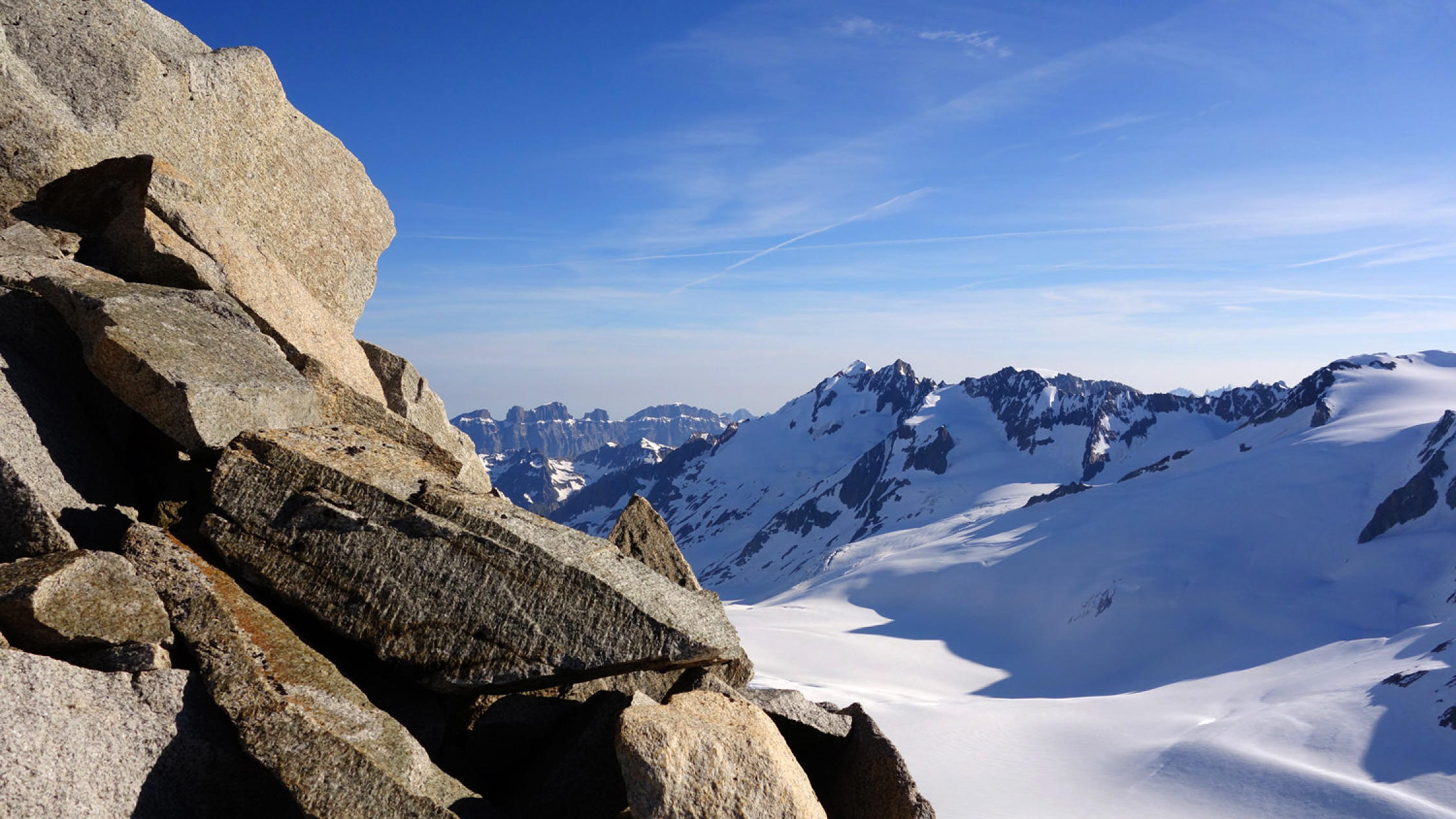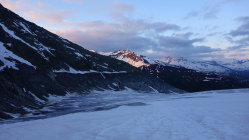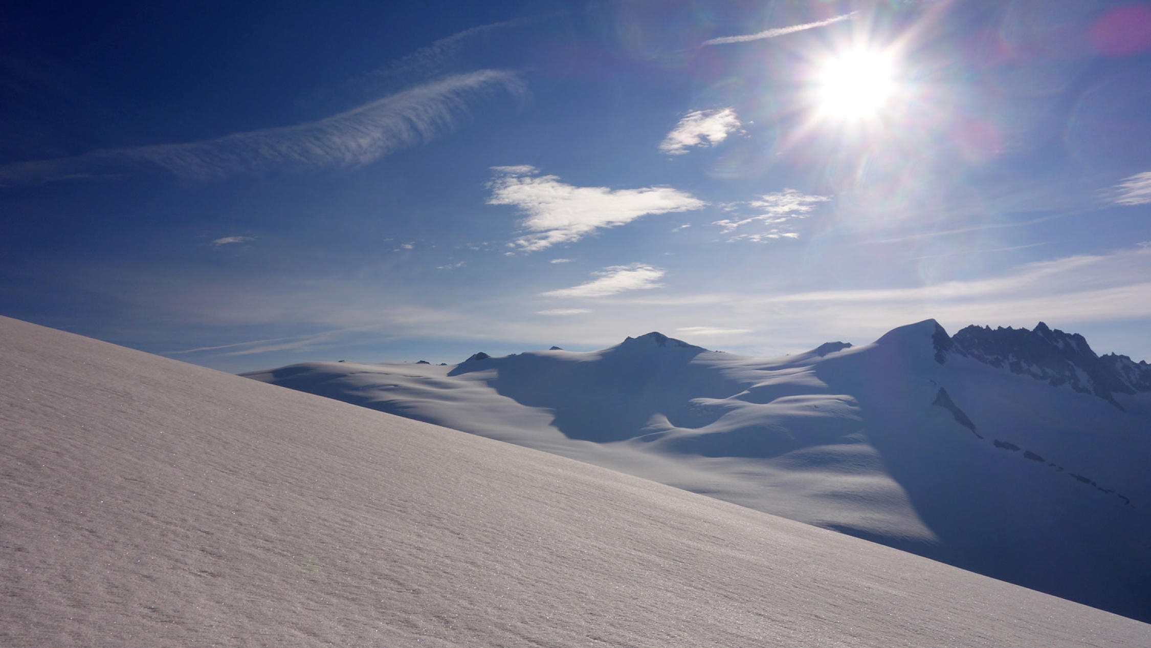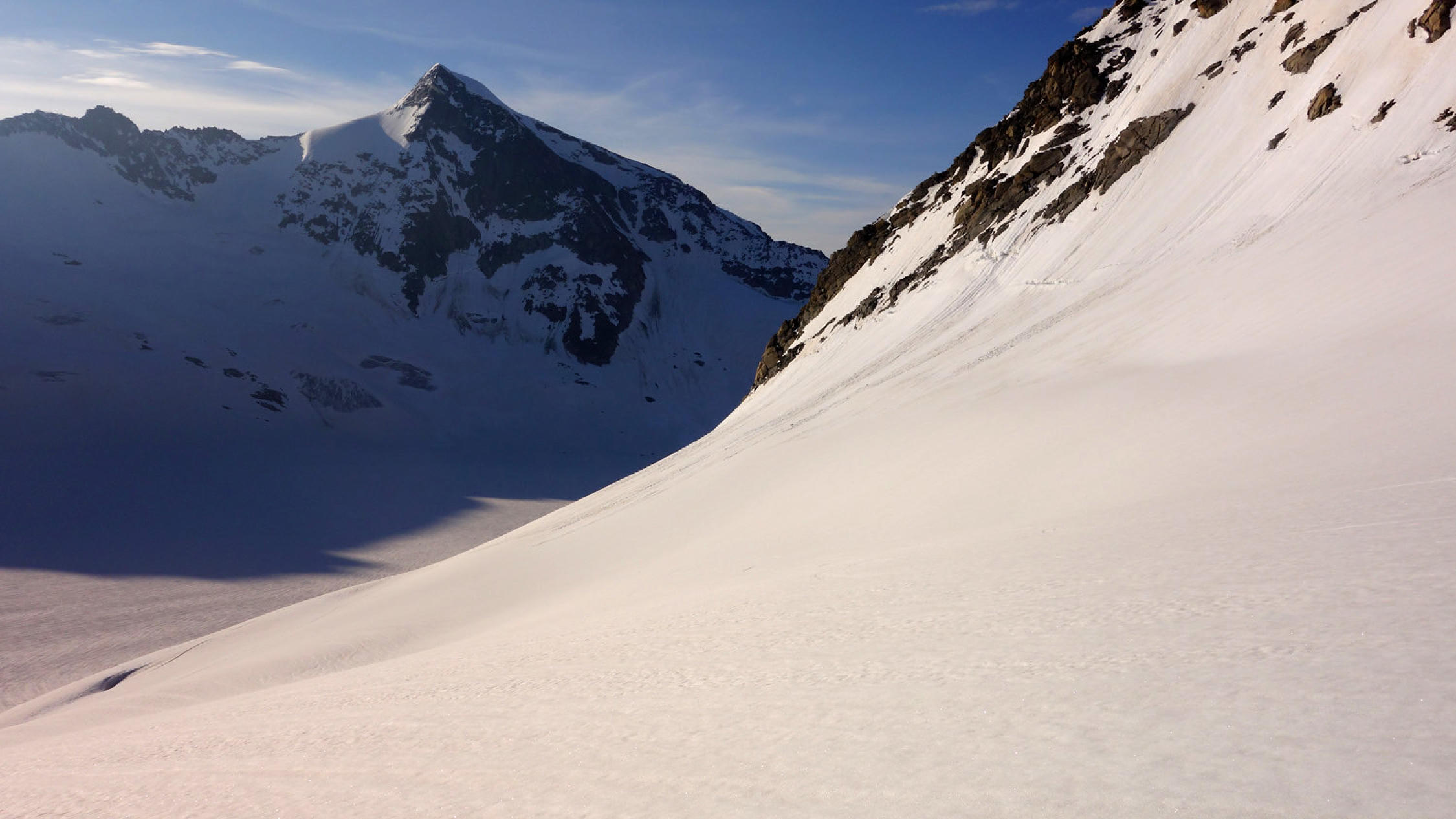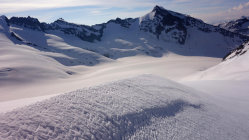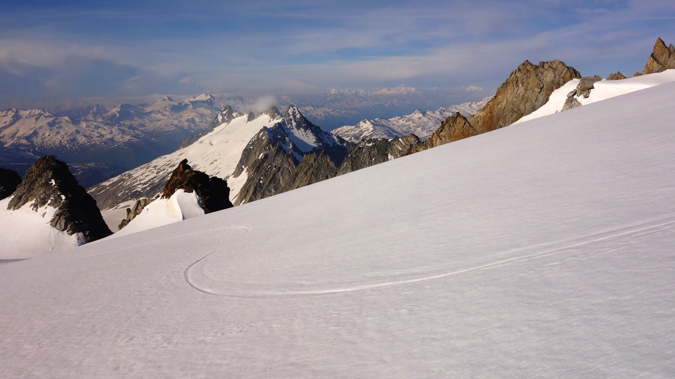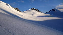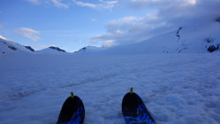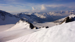 Heute war das Timing perfekt! Los um 5.30 Uhr bei Belvédère, unten schmilzt der Schnee rasant, viele apere Stellen auf dem Gletscher bis ca. 2500m, danach superschön!