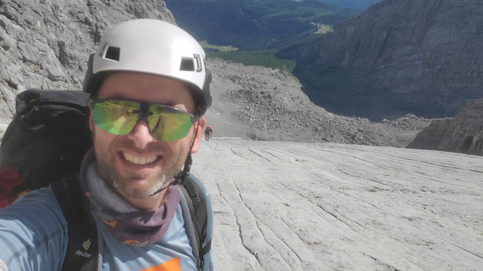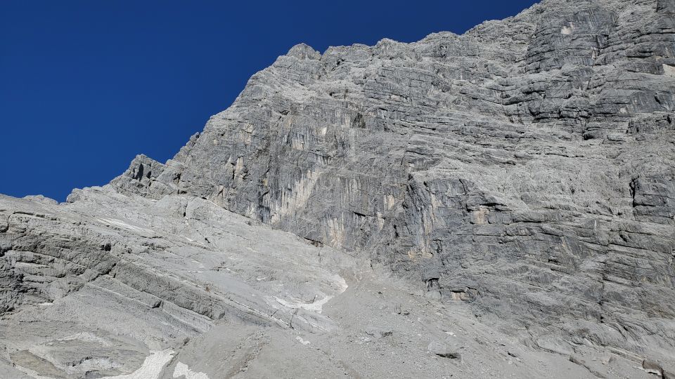 alles bestens, Route weitgehend trocken, nur einige Schneefelder auf dem Band, stören aber nicht, kann man ausweichen; im Schutt zum Einstieg etwas mühsam;
