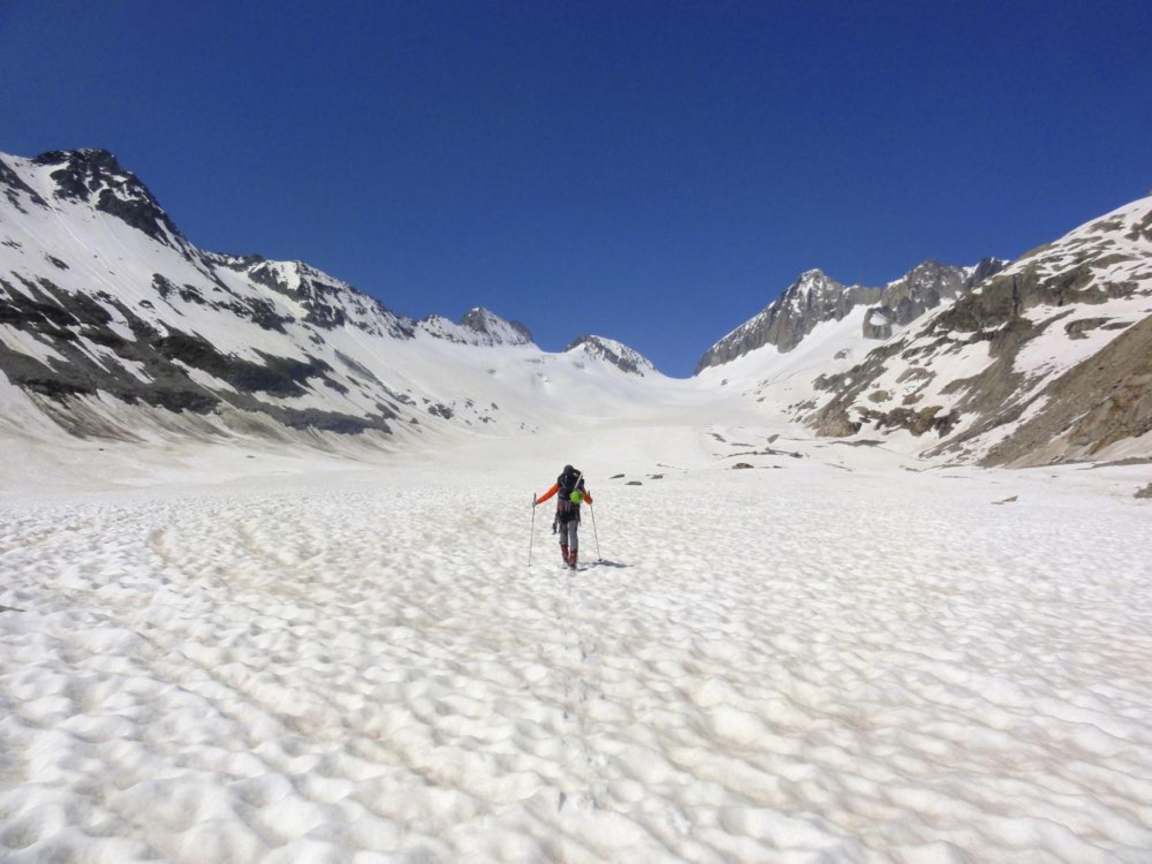 Wir sind vom Berghaus Oberaar via Oberaarjoch ins Gebiet gelangt. Oberaargletscher, Studergletscher, Galmigletscher noch gut eingeschneit. Fieschergletscher etwas weniger -> Spalten beachten.