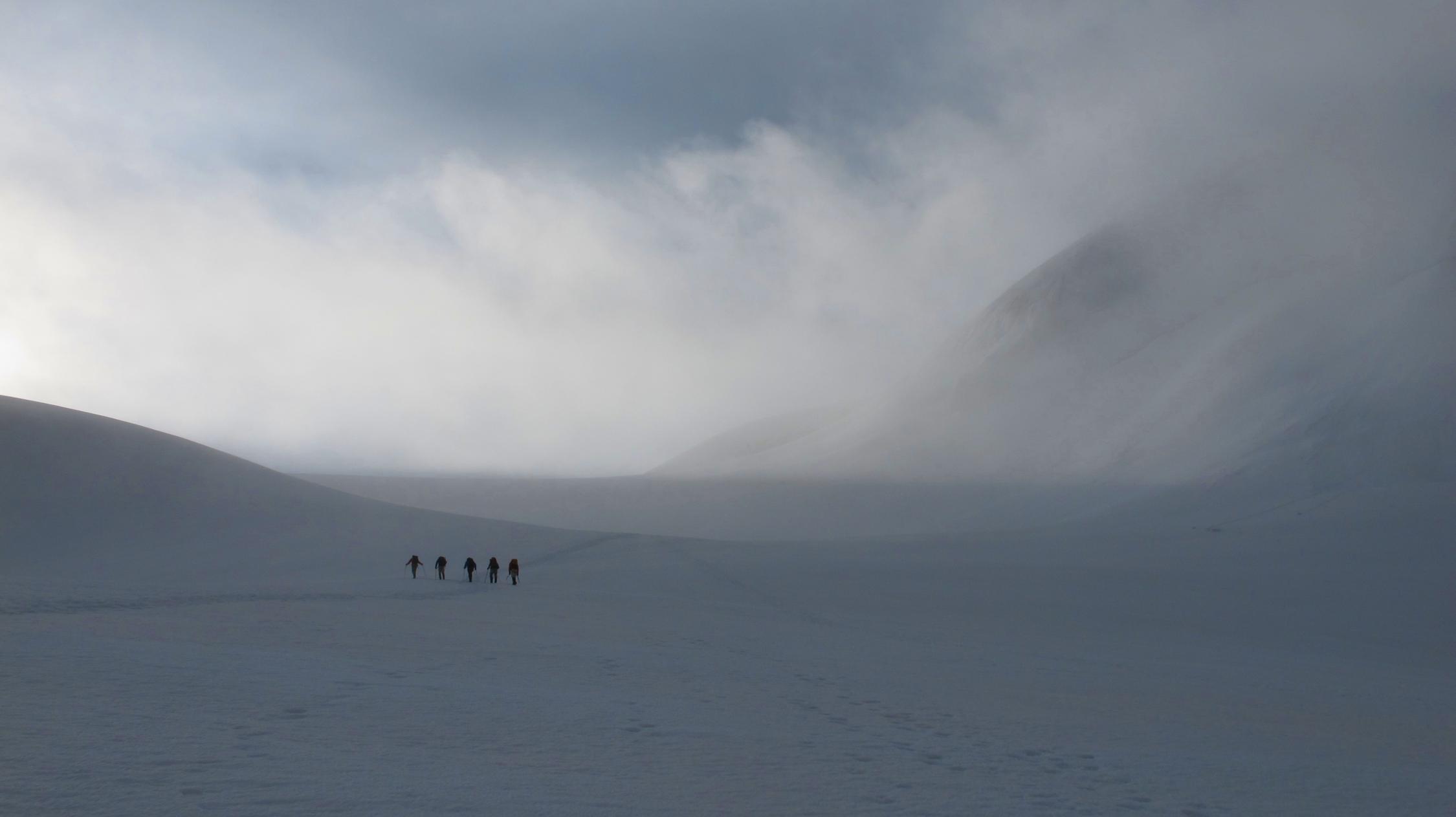 Der Zugang zur Hütte ist bis 2700m schneefrei. Ab hier geschlossene Schneedecke.