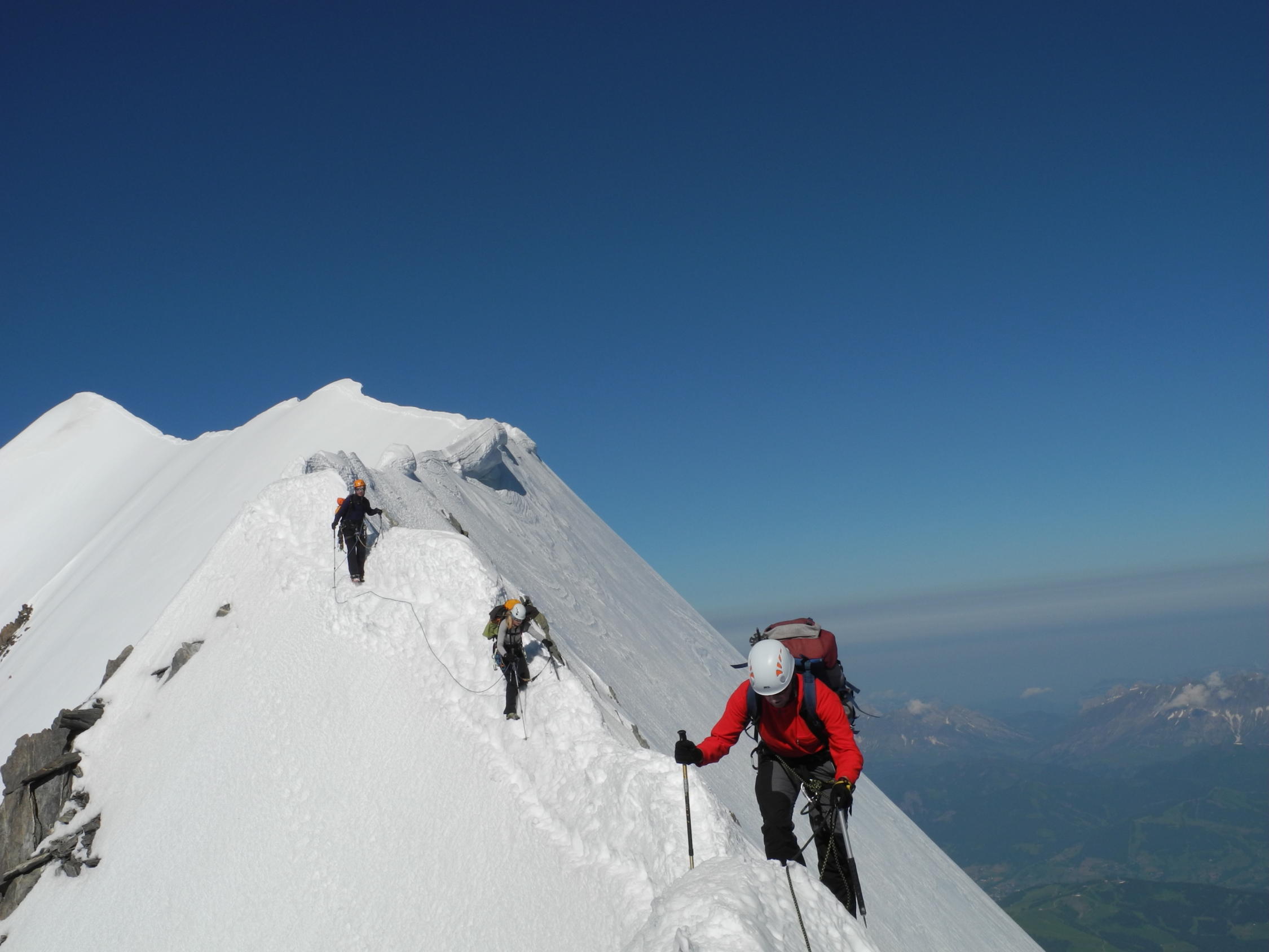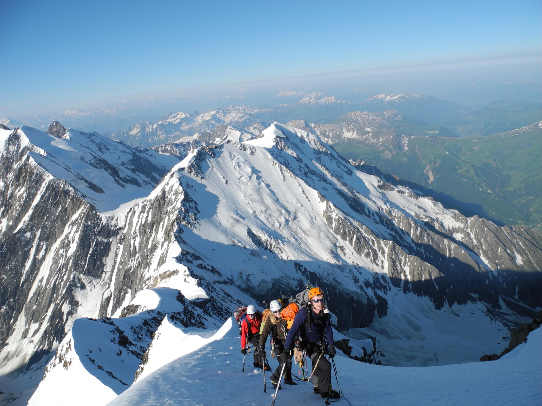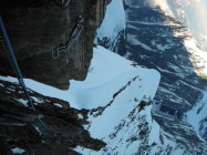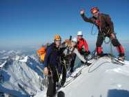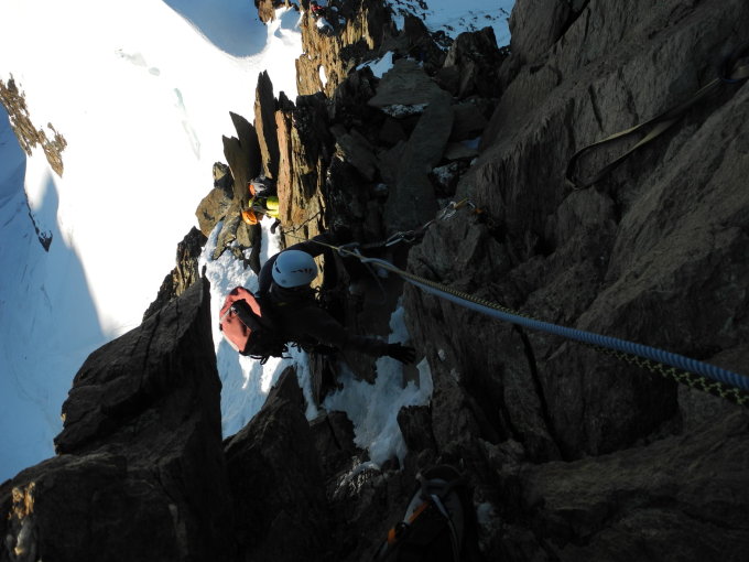 Sehr gute Verhältnisse, auch bereits im "Zustieg" bei der Überschreitung der Domes de Miages, dort lediglich sehr weicher Schnee beim Abstieg zur Hütte. Guter Trittfirn, kein Blankeis, auch an Gipfelflanke. Im derzeit fast überall festen Fels nur in der Verschneidung und an (evtl. fakultativer) Stelle darüber Eis in Fels, aufgrund der gut zu greifenden und tretenden Schuppen. Gute Spur an E-Grat. Ausgesetzt, aber gutmütig, die kurze kurze steile Querung im Aufstieg vor dem Fels erscheint dagegen heftiger im morgendlichen harten Firn.