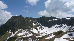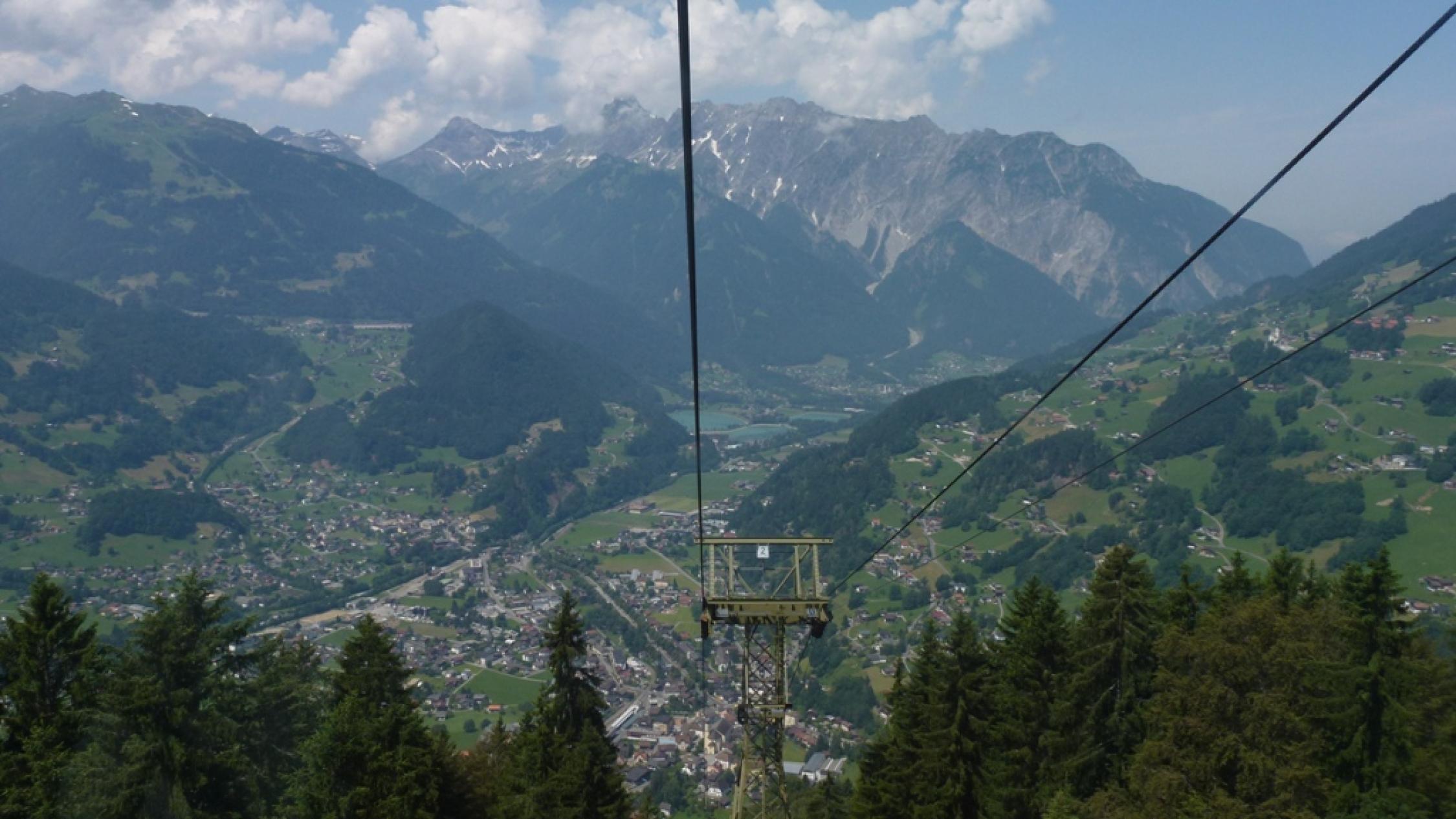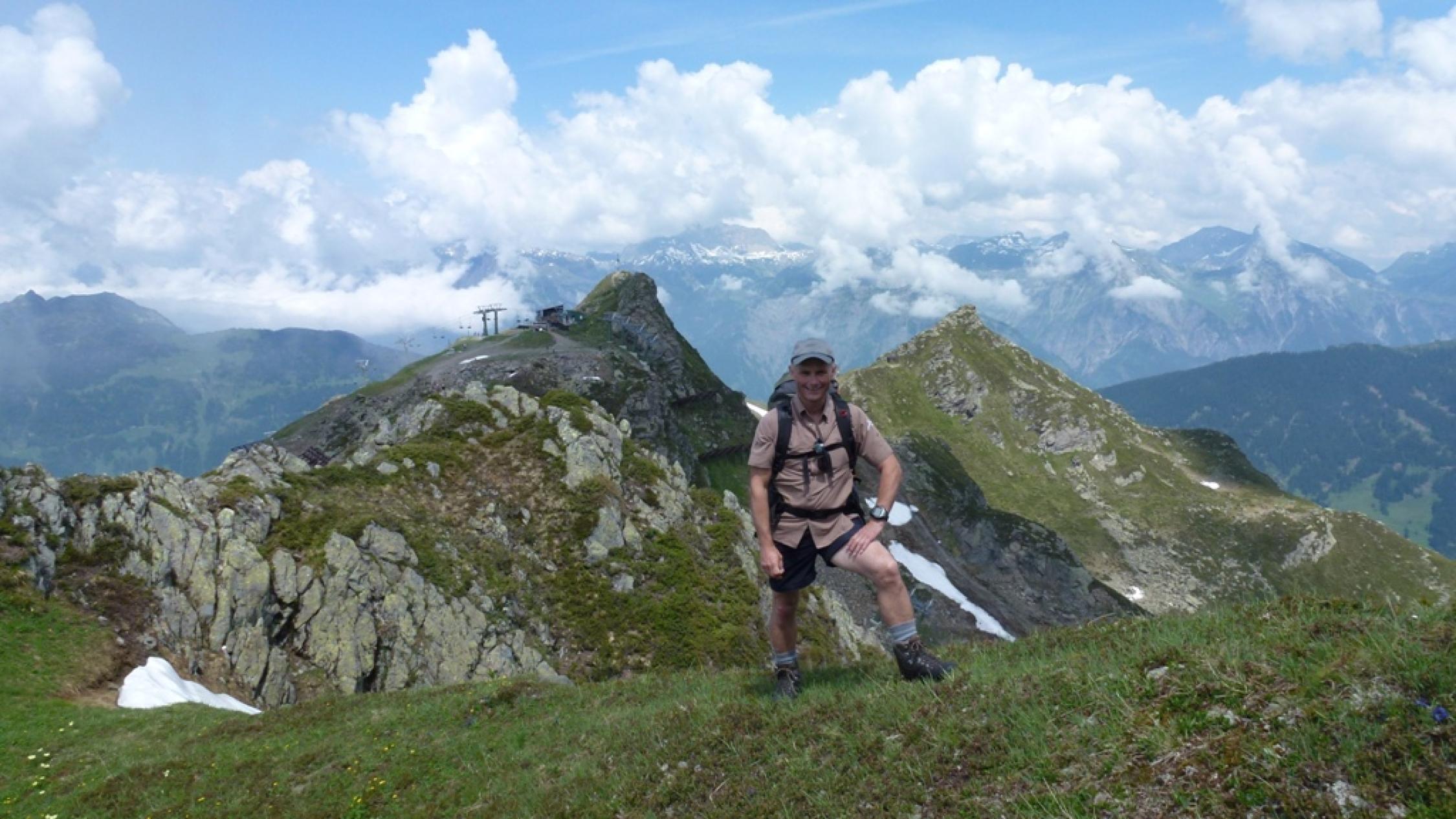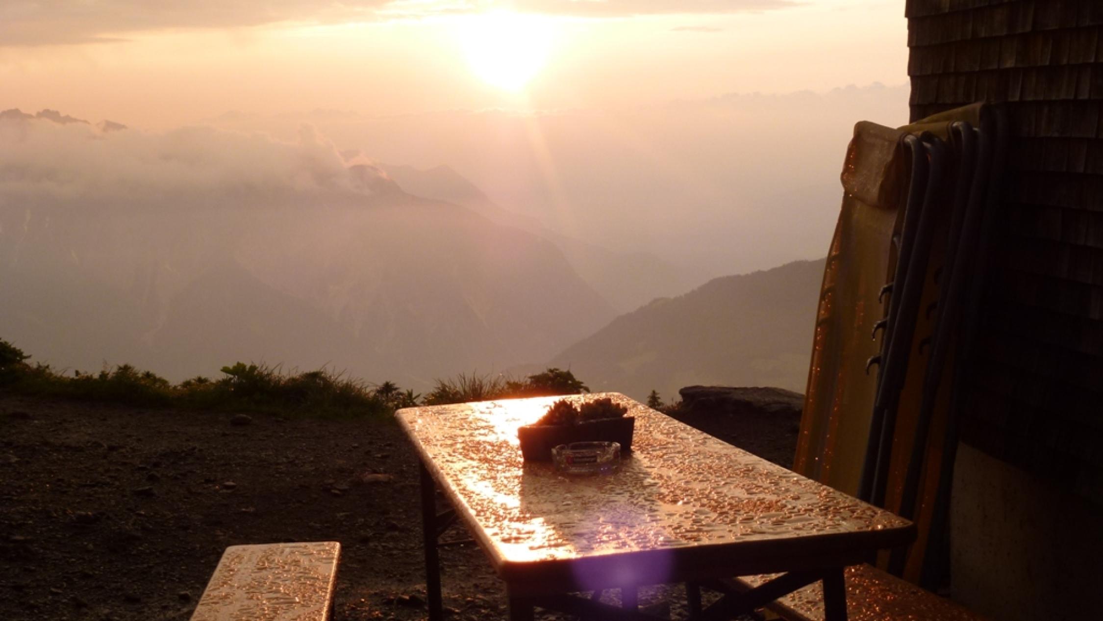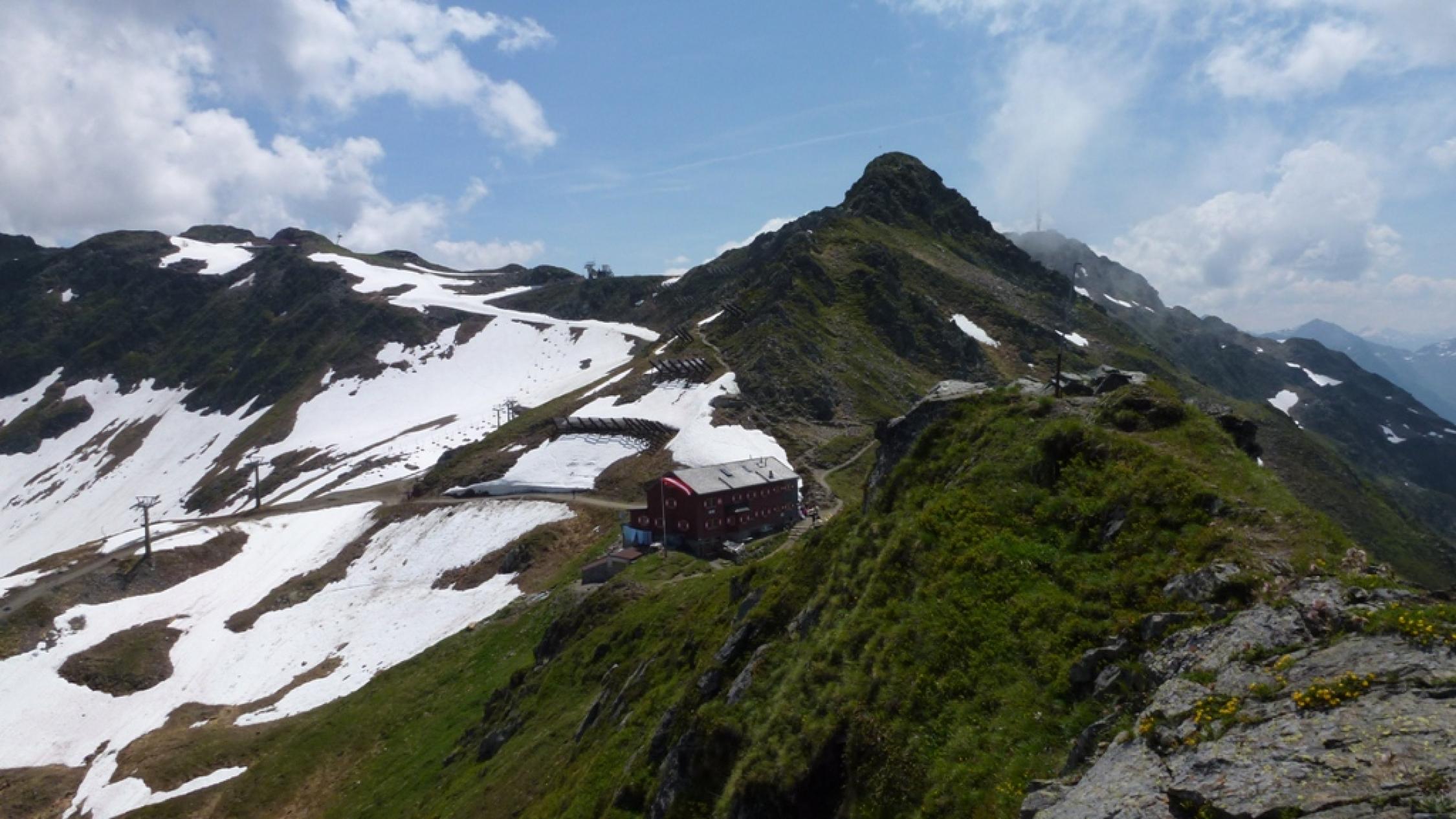 Wir sind gemütlich mit Zug und Seilbahnen bis zum Sennigrat gefahren. In den folgenden Tagen kommen wir noch genug zum Bergsteigen. Nach dem Einchecken bei der Hütte, sind wir mit leichtem Gepäck zum Hochjoch losmarschiert. Vorher musste natürlich bei atemberaubendem und erhabenem Blick ins tiefe Tal und zum Rätikon noch etwas getrunken werden. Beim Anstieg zum Kapelljoch ging es schon los mit der Scheestapferei, die uns auch in den nächsten Tagen immer wieder beschert war. Auch ohne Schnee erfordert der steile und ausgesetzte Grat zum Hochjoch Trittsicherheit und Schwindelfreiheit. Die aufziehenden Quellwolken kündigten Gewitter an und so wurden wir schnell wieder zur Hütte getrieben. Vom Kreuzjoch hinunter in die Hütte war es dann zwar nicht mehr weit, aber zum Nass werden hat es dennoch gereicht. Gegen Abend lösten sich die Wolken Zusehens auf und ließen uns einen schönen folgenden Tourentag erwarten.