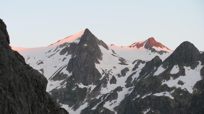 Heute Morgen war der Schneedecke bis auf den Gipfel wegen der klaren und kühlen Nacht durchgehend gefroren.