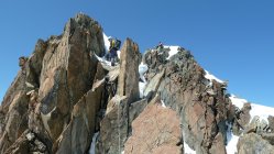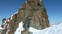 Der Felsen ist trocken und sehr schön zu klettern. Dennoch sind wir alles mit Steigeisen geklettert. Denn wie schon erwähnt liegt noch viel Schnee in den Rinnen und zwischen den Felsen. Da dieser glücklicherweise hart war, hatte man mit Steigeisen ein besseres Gefühl. Auch die ausgesetzten Gratpassagen ließen sich so besser begehen. Da inzwischen auch viele Begehungen vom Sattel vor der Mittelspitze durchgeführt werden, dürfte sich inzwischen eine sehr gute Spur gebildet haben.
