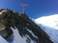 Der Uebergang vom Gletscher auf den Ostpfeiler ist zurzeit problemlos. Bis auf den Grat sind moderne Standplätze eingerichtet, dannach findet man nur noch alte Haken vor, aber es lässt sich sehr gut natürlich absichern. 2-3 Friends sind sehr wertvoll. Der Fels ist trocken und es sind noch wenige Schneeflecken im oberen Teil vorhanden. Im oberen Gratabschnitt findet man ein paar wenige Wassereisstellen vor. Der anschliessende Firnaufstieg bietet zurzeit beste Verhältnisse.