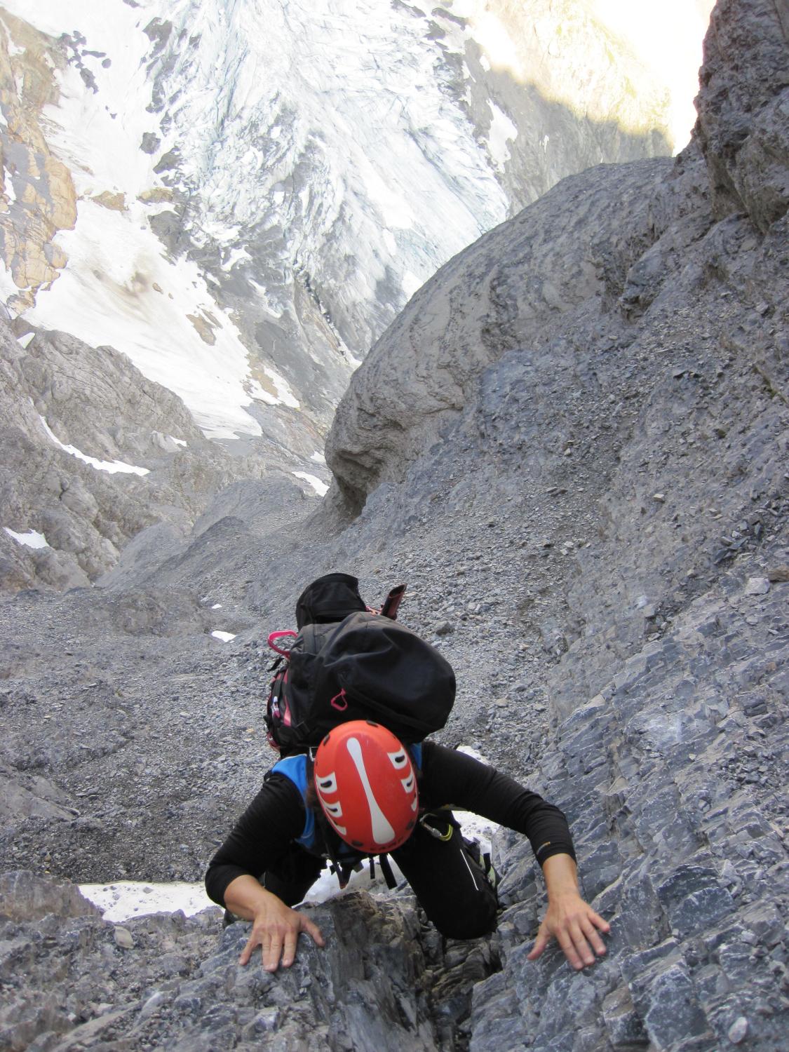 Die Tour verlangt gutes Gespühr für den Routenverlauf (tendenziell immer leicht schräg links hoch; im Mittelteil nicht zu den rot/gelben Türmen hoch klettern, sondern einfach schräg links hoch halten). Die Schlüsselstellen sind schlecht absicherbar und deshalb ist sicheres Gehen in brüchigem S-Gelände angesagt.